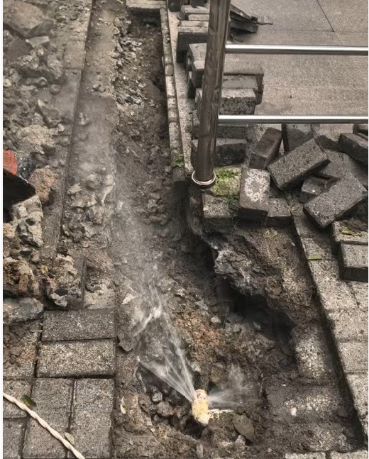 由于漏水管道位于小区停车位路面以下,无法精准确定漏水部位,如需彻底维修恢复,涉及路面开挖、管道检测、更换铺设、路面恢复等多个环节。