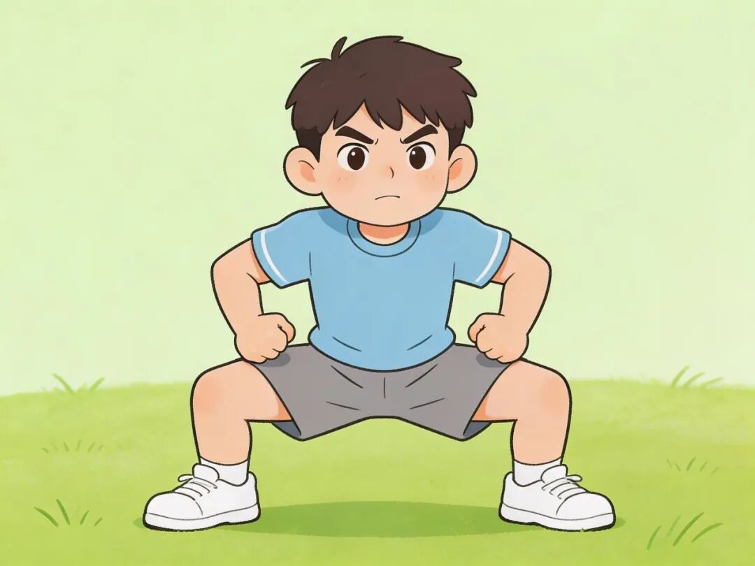 正确做法:双脚分开与肩同宽,上身保持挺直,膝盖弯曲,使身高降低10厘米左右,膝盖不超过脚尖。要注意,沉腰下蹲时,脚尖和膝盖都要向外张开,能减轻膝盖负担,避免运动损伤。