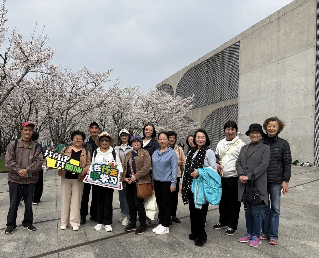 沿着滨江步道往前走,就到了此行的终点站——龙美术馆。恰逢馆外的樱花盛花期,如云似霞的樱花簇,搭配美术馆冷峻大气的清水混凝土建筑,刚柔并济,美不胜收。学员们忍不住放慢脚步,拿出手机拍照打卡,有的和樱花同框,有的定格建筑之美,欢声笑语间,把春日的浪漫和快乐一一留存。