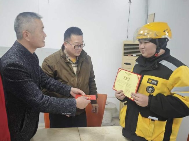 美团众包骑手宗晟源路过晶尚坊时,凭借常年夜间送单的细心与警觉,一眼察觉到商铺内的异常。他立刻放下休整计划,快步跑向隔壁仍在营业的商户告知险情,并在第一时间拨打119报警电话。
