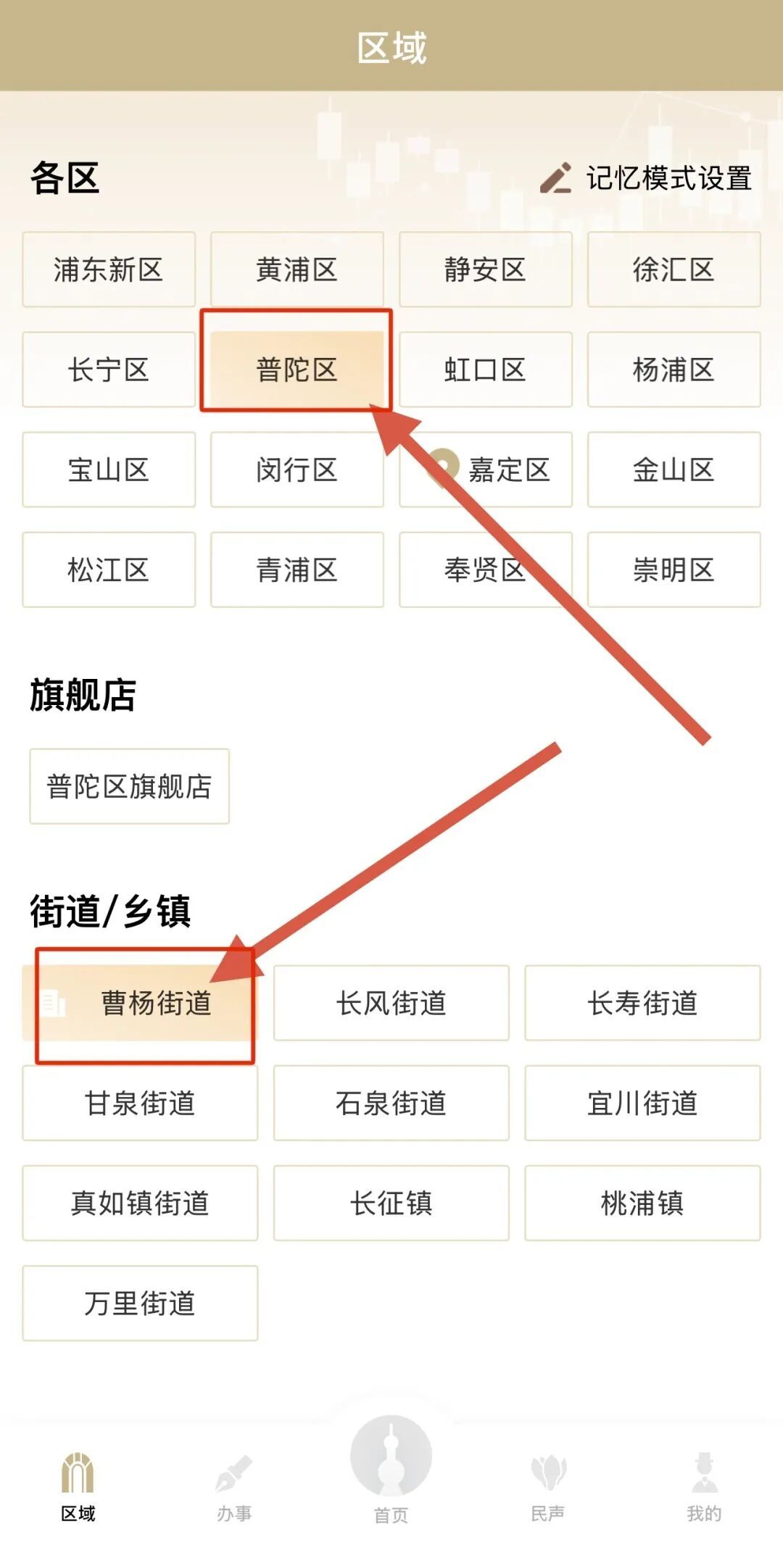 1.打开“随申办市民云”APP,点击左下角“区域”,选择“普陀区-曹杨街道”,进入“美好生活·掌中宝”页面。