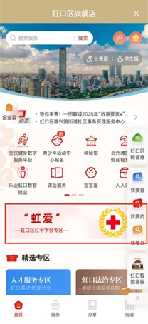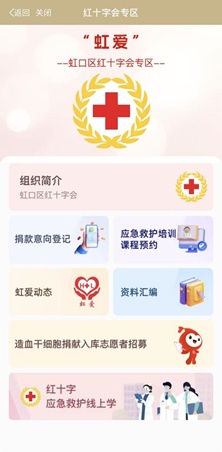 市民可通过“虹爱”专区,足不出户在线完成捐款意向登记、应急救护培训课程预约、造血干细胞捐献入库志愿者招募等事项的全流程线上办理;同时可查阅虹口区红十字会组织介绍,实时掌握爱心行动进展,了解红十字相关政策法规、工作成果等内容。