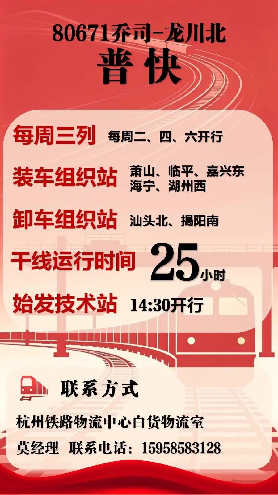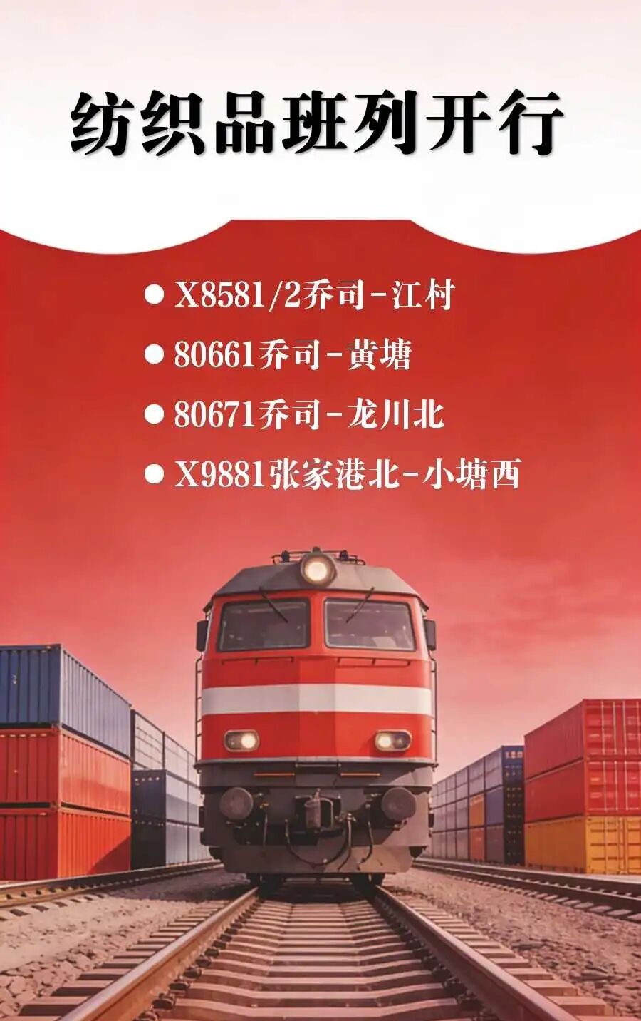 进一步推动形成长三角与珠三角间跨区域产业协作,打造区域间纺织品班列品牌。精准对接纺织业上下游企业需求,新图中新增乔司至江村、张家港北至小塘西、乔司至黄塘、乔司至龙川北间快速多式联运班列、普快多式联运班列、普快城际班列等纺织品牌班列4列,预计新增产品年运能52万吨左右。
