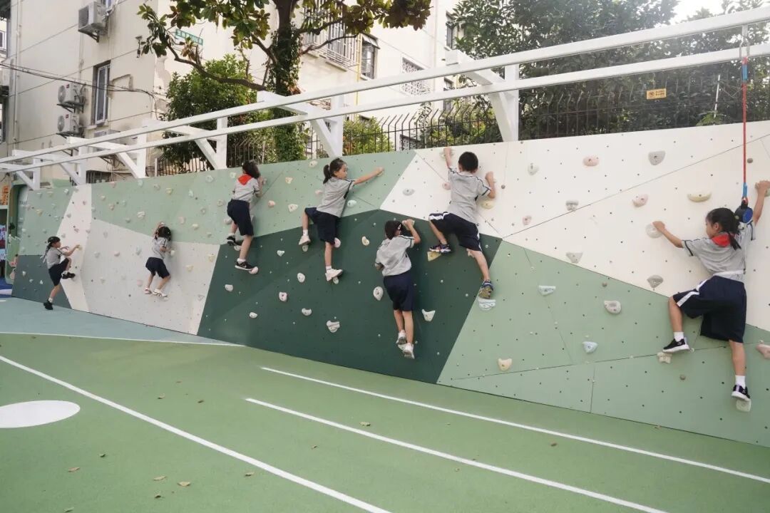 浦东新区竹园小学以一场“空间革命”,在有限场地里为孩子们挤出运动空间。去年,学校取消了几十个教师停车位,将这片区域铺上塑胶跑道,改造成“FUN肆乐跑区”;中庭原本闲置的小花园也被精心改造,增设了绳网、梅花桩、肋木架和爬竿,打造成攀爬综合活动区。学校还向立体空间要资源,在围墙上增设攀岩点,在屋顶开辟兼具安全性与挑战性的“勇敢者之路”,就连走廊也布置了摸高墙,让不大的校园变成了“无处不运动”的生态空间。
