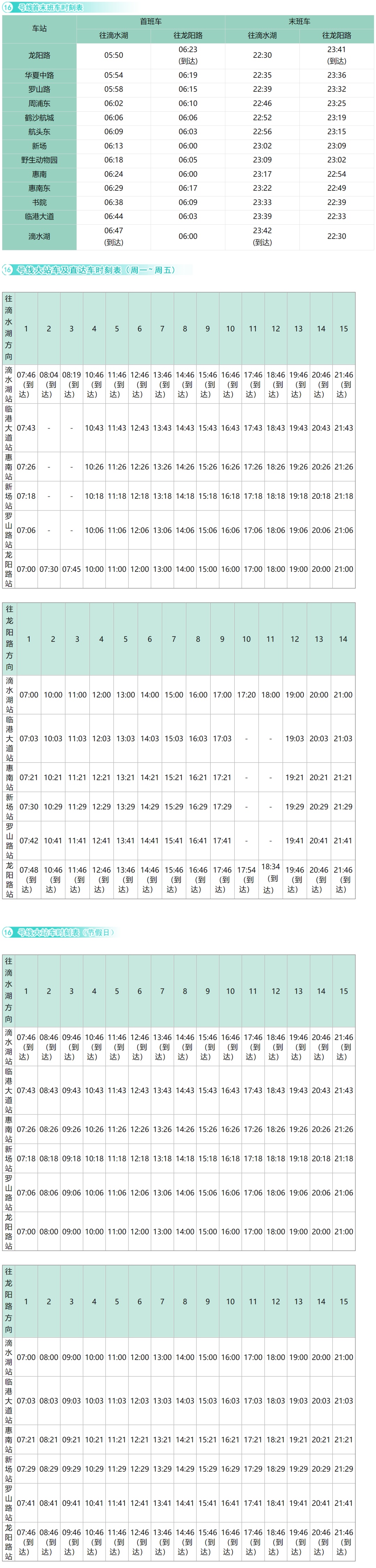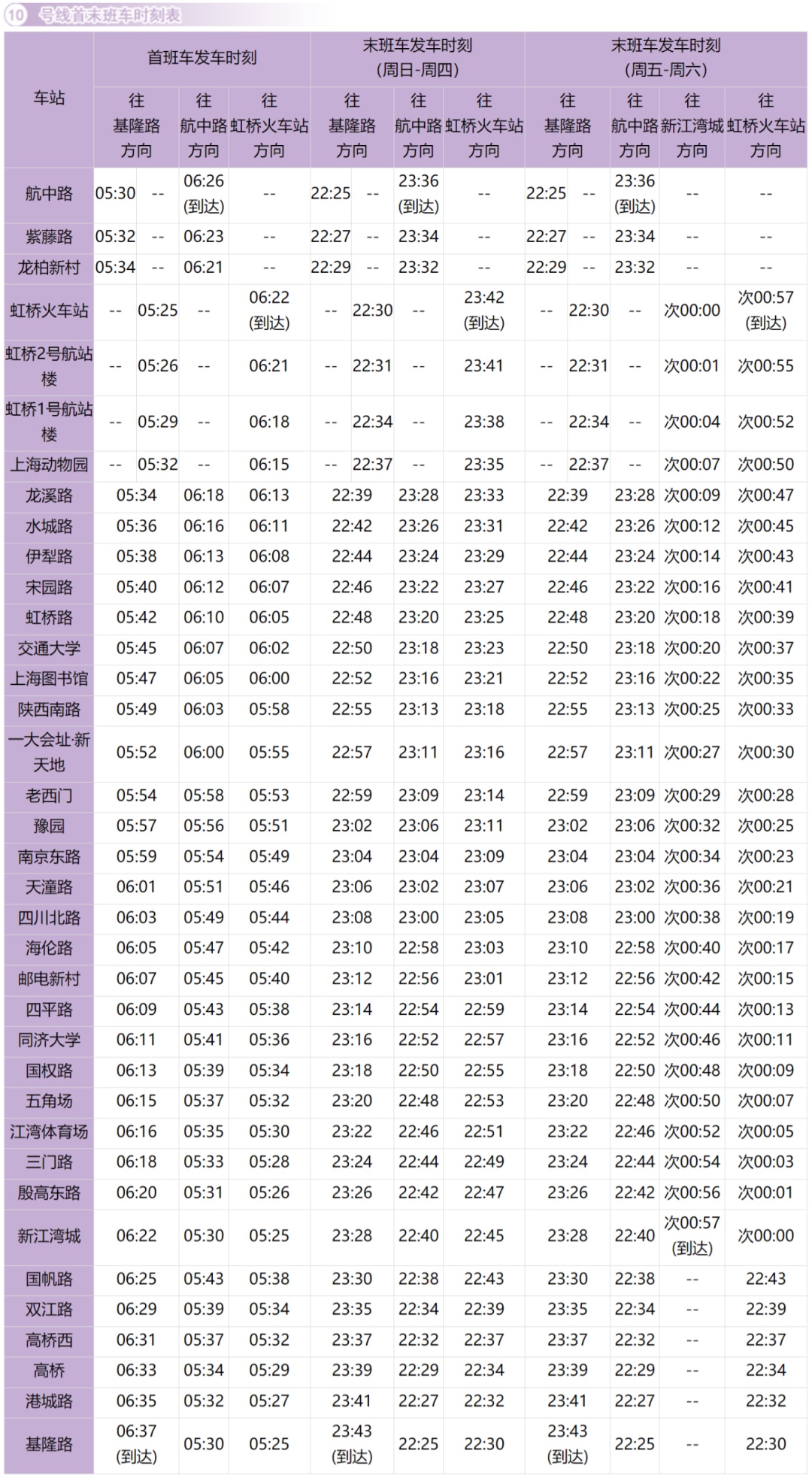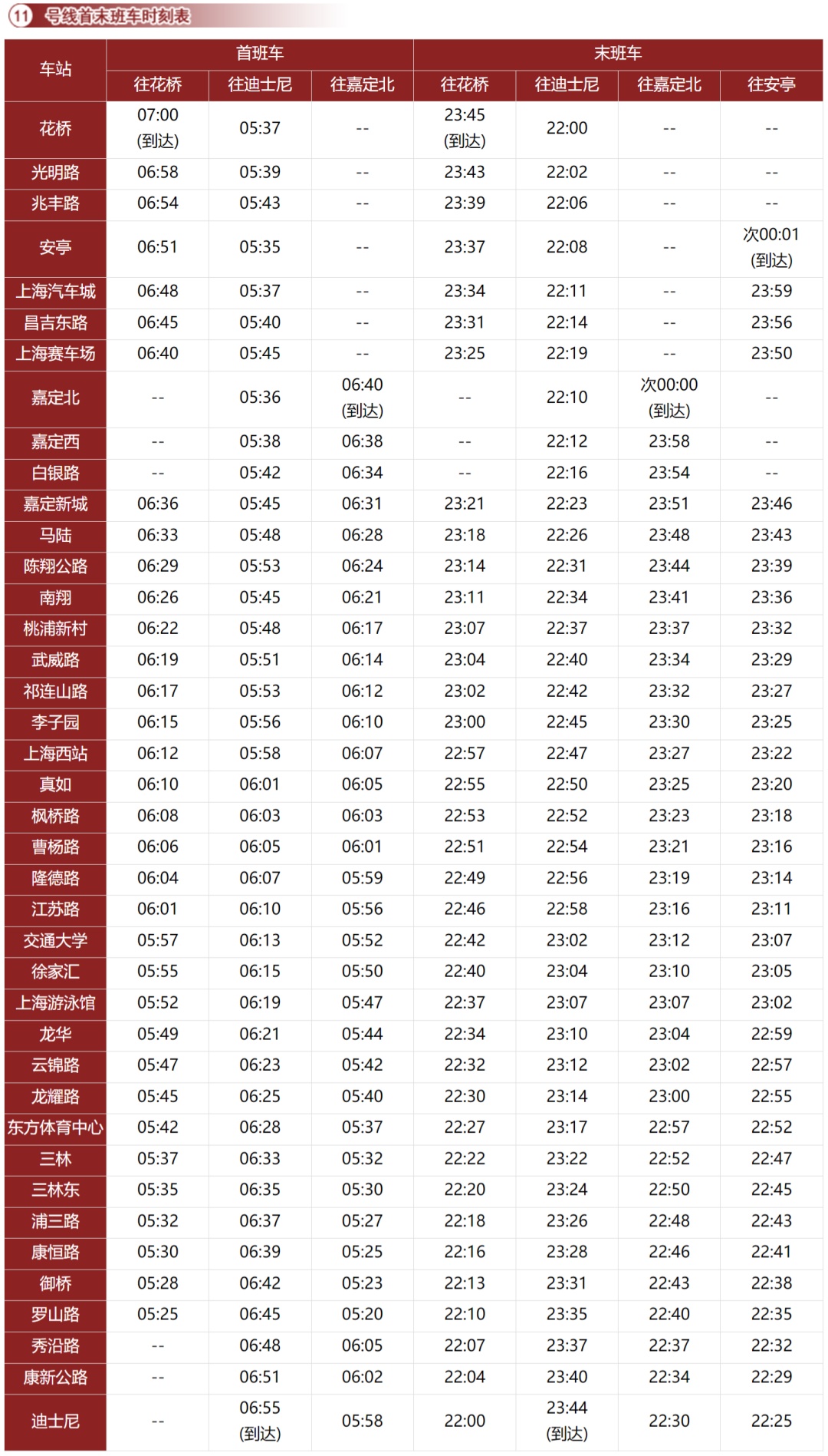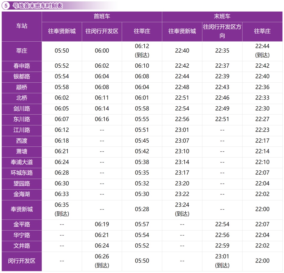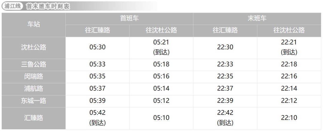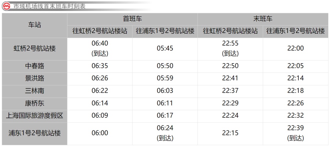 据申通地铁集团消息,为进一步适应市域机场线客流变化,提升乘客出行体验,本月起,上海轨道交通市域线机场联络线启用新版列车运行图,对首末班车时间进行调整优化,较之前全天多运营30分钟。上海地铁全网首末班车时刻表也随之更新。详见下图,请大家收藏~
