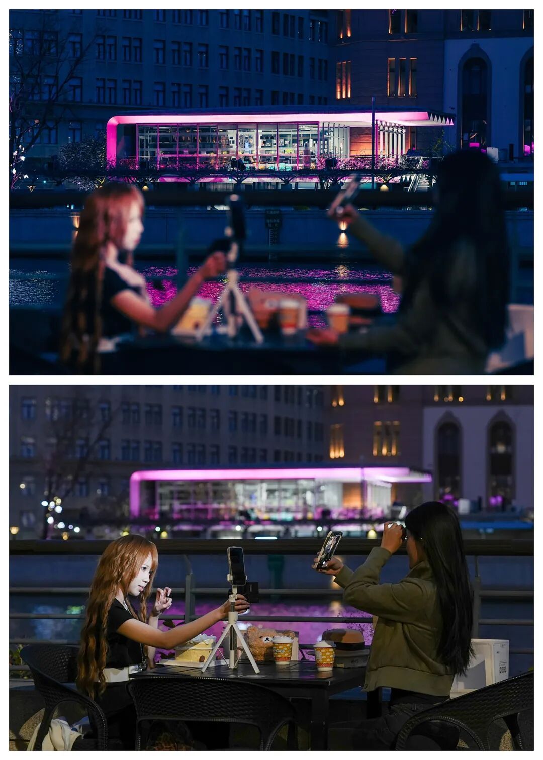 加油站咖啡馆和外滩源教堂的轮廓被暖光照亮;