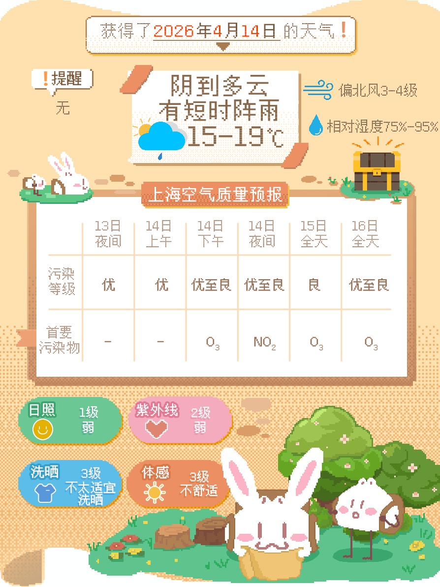 今天(4月14日)阴有时有阵雨,上午雨势有所减弱,转为阴到多云有短时阵雨,大家外出带好雨具。全天气温在15~18℃,偏北风3~4级,相对湿度95%~75%。