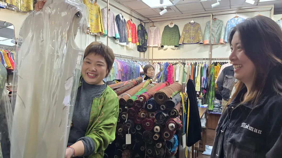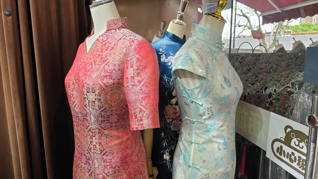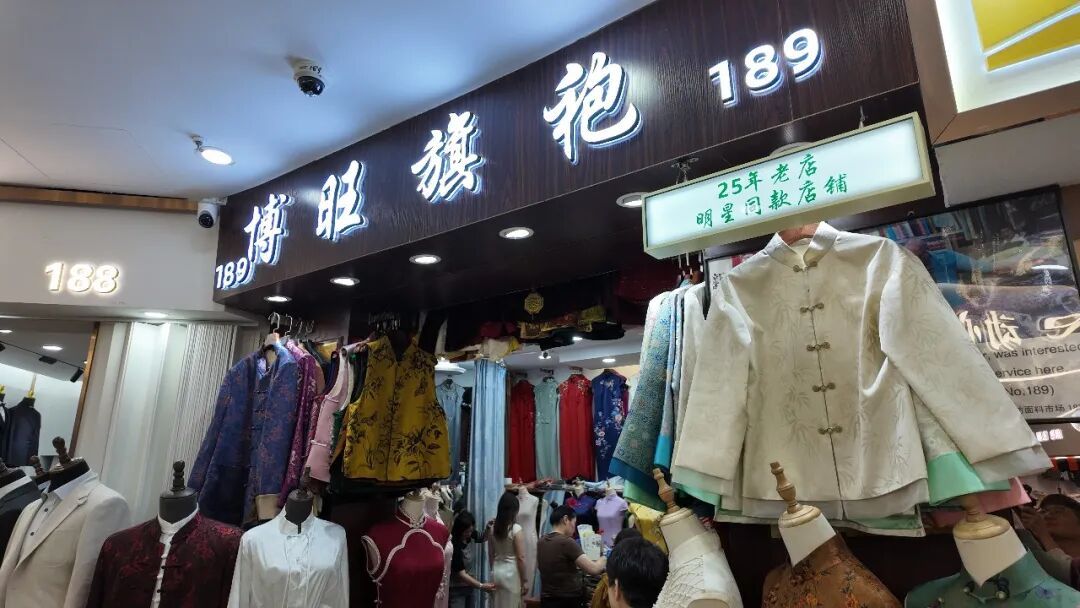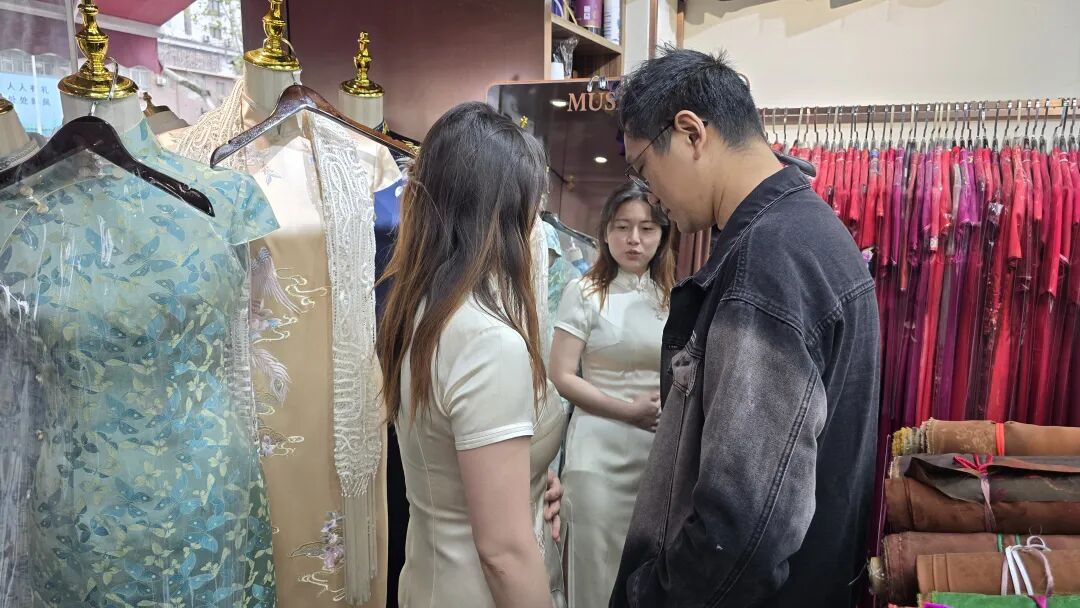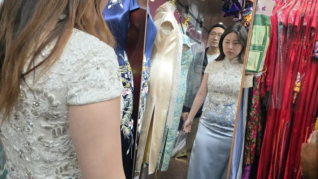 谈及最终选定的旗袍,苏晨眼神里满是喜爱:“这款旗袍上有凤凰图案,还有闪钻装饰,凤凰作为结婚信物很有寓意,穿上显得大气又端庄。”她表示,之所以选择来南外滩轻纺面料市场选购旗袍,正是因为这里有老底子的手工匠心——十几款衬衫领型任你选、纯手工绣花盘扣精致耐看;还有让老外都惊叹的性价比。更重要的意义在于:每一件喜服,都是独一无二的。商场里买不到的合身与温度,这里一针一线都能给。