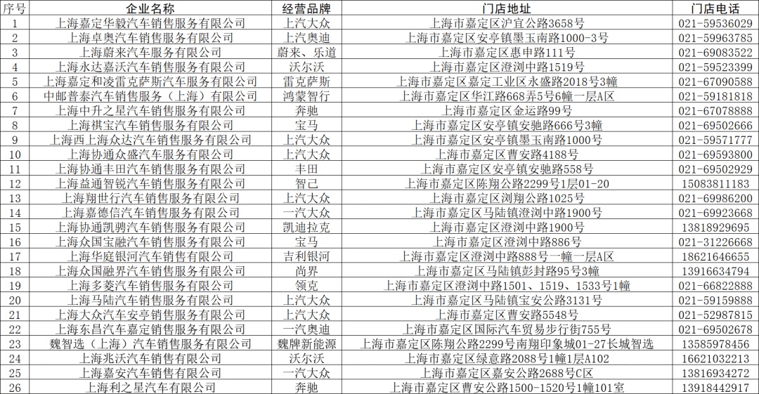 嘉定区汽车消费补贴活动汽车销售企业名录