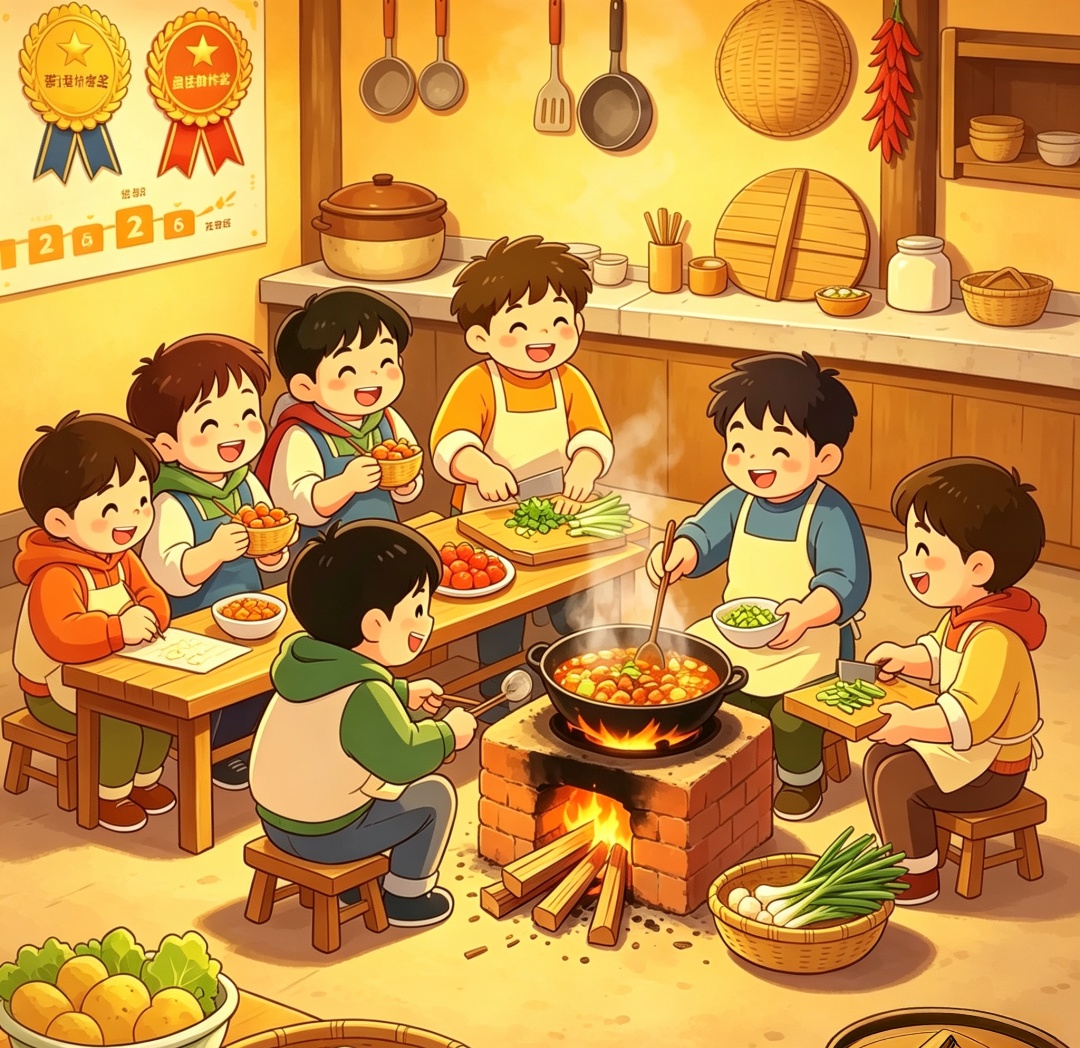 积分颁奖后,分组体验土灶烹饪,协作共享美食。