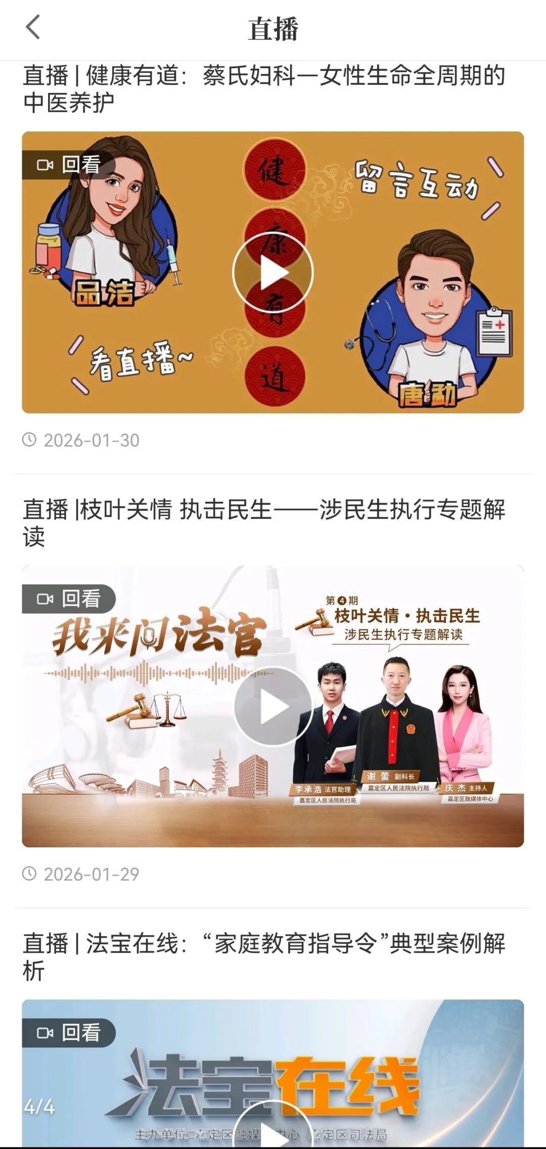 在“上海嘉定”APP首页中,点击“直播”按钮,可以回看“健康有道”往期节目。