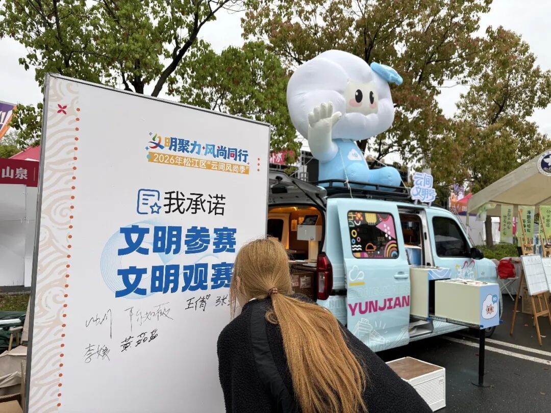 赛场之外,“云间文明号”小车则成了人气爆棚的文明打卡点。浅蓝色的车身印满松江特色元素,车顶巨大的“云嘟嘟”气模挥手迎客,吸引了众多跑者、市民驻足;小朋友们在“文明我来记”白板前,一笔一划写下文明寄语;跑者在签名墙上郑重签下名字,用行动许下文明的约定。