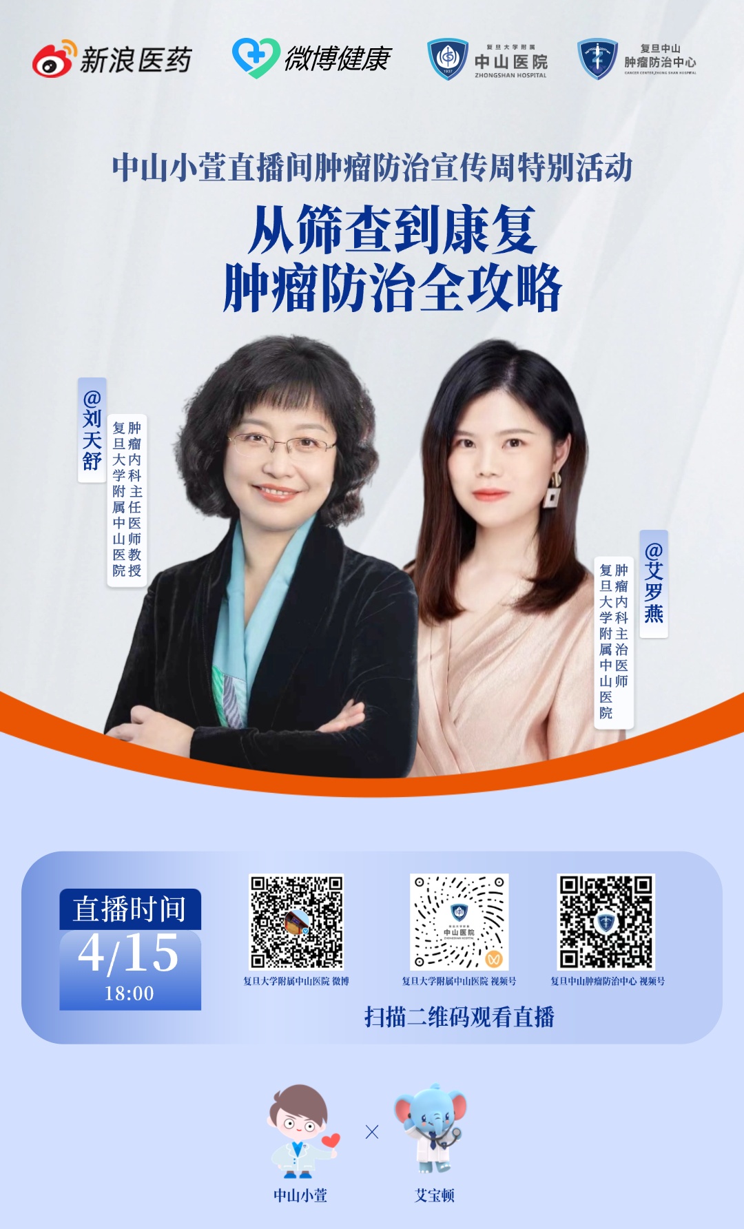 直播平台:中山医院官方微博、中山医院官方视频号、复旦中山肿瘤防治中心视频号