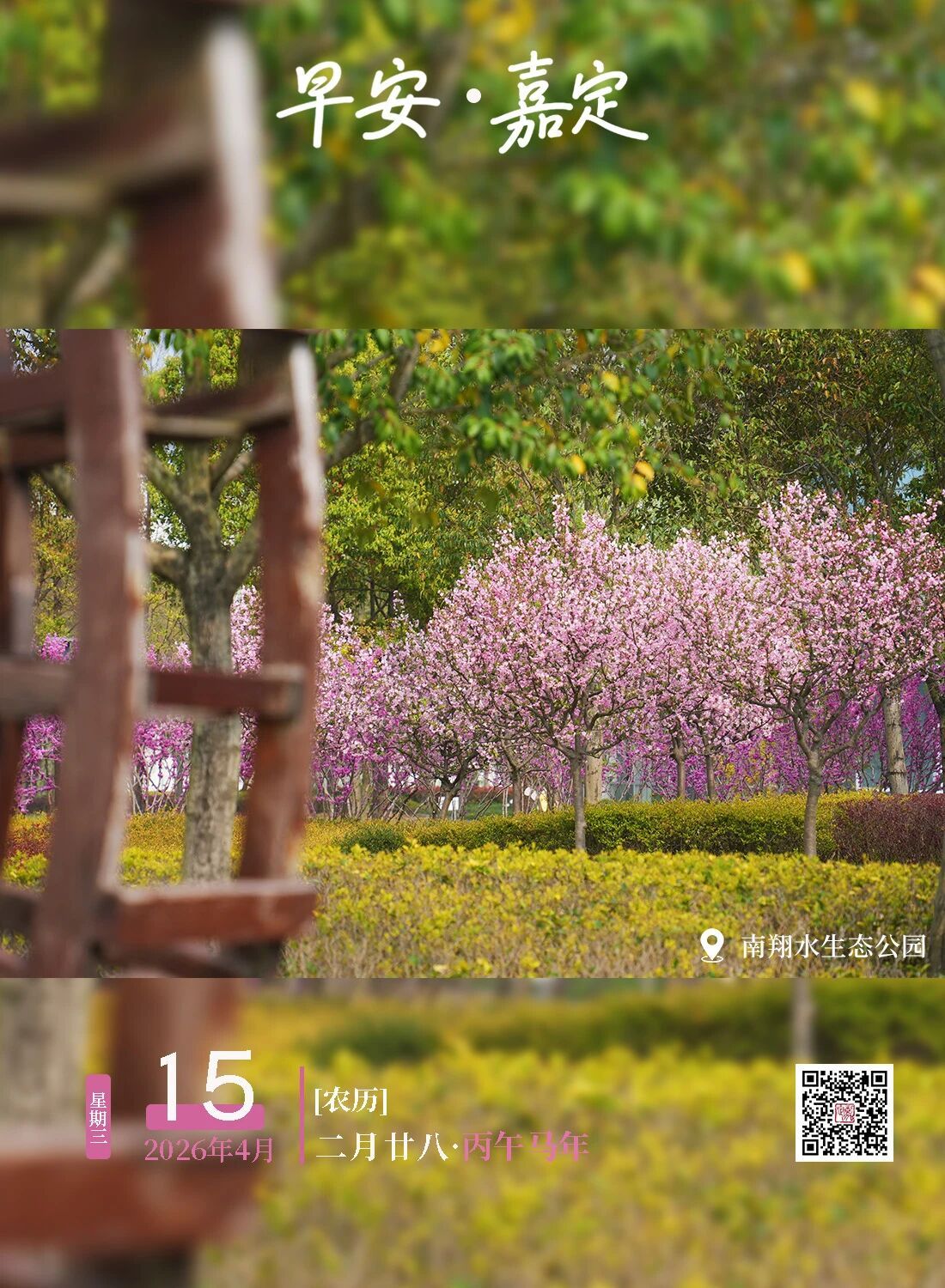 粉花如云缀满枝头,绿意漫过青草地,把春日的温柔尽数铺展。早安!愿你今日心境澄澈,步履从容,在春日的馈赠里,收获满格的温暖与力量。