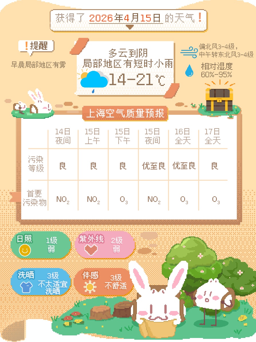 4月16日(周四):多云到阴转阴有时有阵雨,15~20度