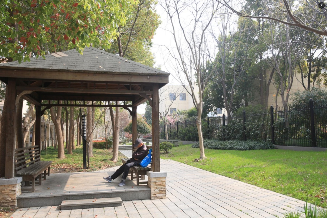 5330平方米,是这几个里最大的。视野开阔,路面平整,亭廊可以遮阳挡雨。水杉、红枫、桂花……四季皆有景致。遛娃、散步、晒太阳,都合适。
