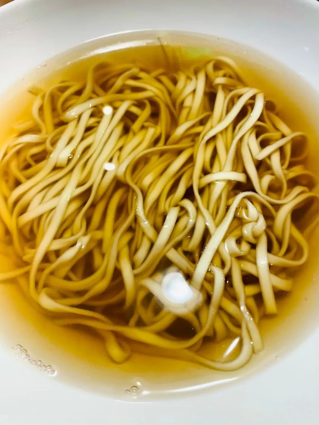 面是小宽面,犹如韭菜般宽细,因为是多道揉轧,所以也很有嚼头。那些服务员,端着面,好像招呼邻居一般,“侬额面来了”,顺手把面碗朝侬面前一放,等侬抬头,伊已经蛇形般穿堂而去……