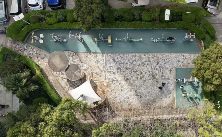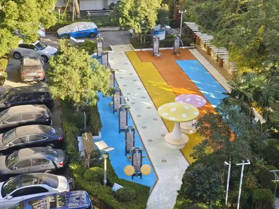 治理过程中,党总支牵头搭建共治平台,通过联席会议、居民议事等形式凝聚合力。改造中聚焦安全、实用与美观,将坑洼水泥地更换为渗水性好、防滑减震的彩色沥青地面,搭配多巴胺色彩色块提升活力。并全面更新符合国标的健身器材,优化圆角设计,补种桂花、紫薇等乡土植物,增设防腐木休闲长椅,让花园更宜居。如今的街心花园,环境面貌焕然一新。
