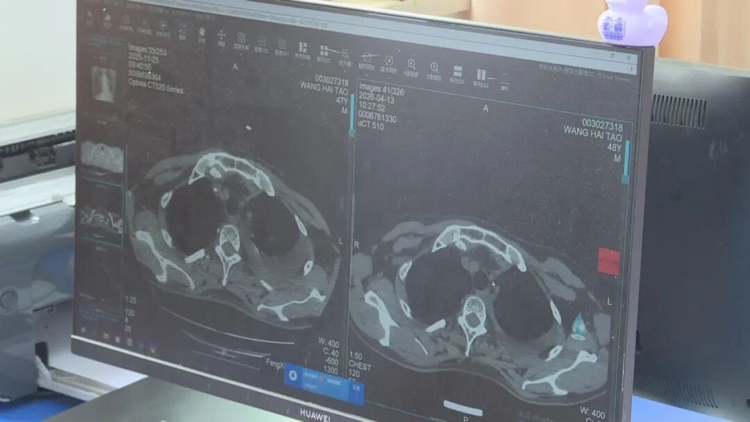 王先生于2024年被确诊为左肺小细胞肺癌。回忆起发病经过,他仍感到意外:“就是喝酒的时候呛了一口,感觉呛到肺里了。两三天后开始咳嗽,还咳出血丝。以前什么症状都没有。”王先生坦言,自己平时只做简单的胸片检查,并没有进行过针对性的肺部肿瘤筛查。确诊后,他一度试图用中药偏方控制病情,但胸腔积液反复加重,病情迅速恶化。最终,他来到奉贤区中心医院,接受了规范化内科治疗联合腔内治疗、肿瘤深部热疗,目前肿瘤在CT影像上已基本看不到,精神状态明显改善。