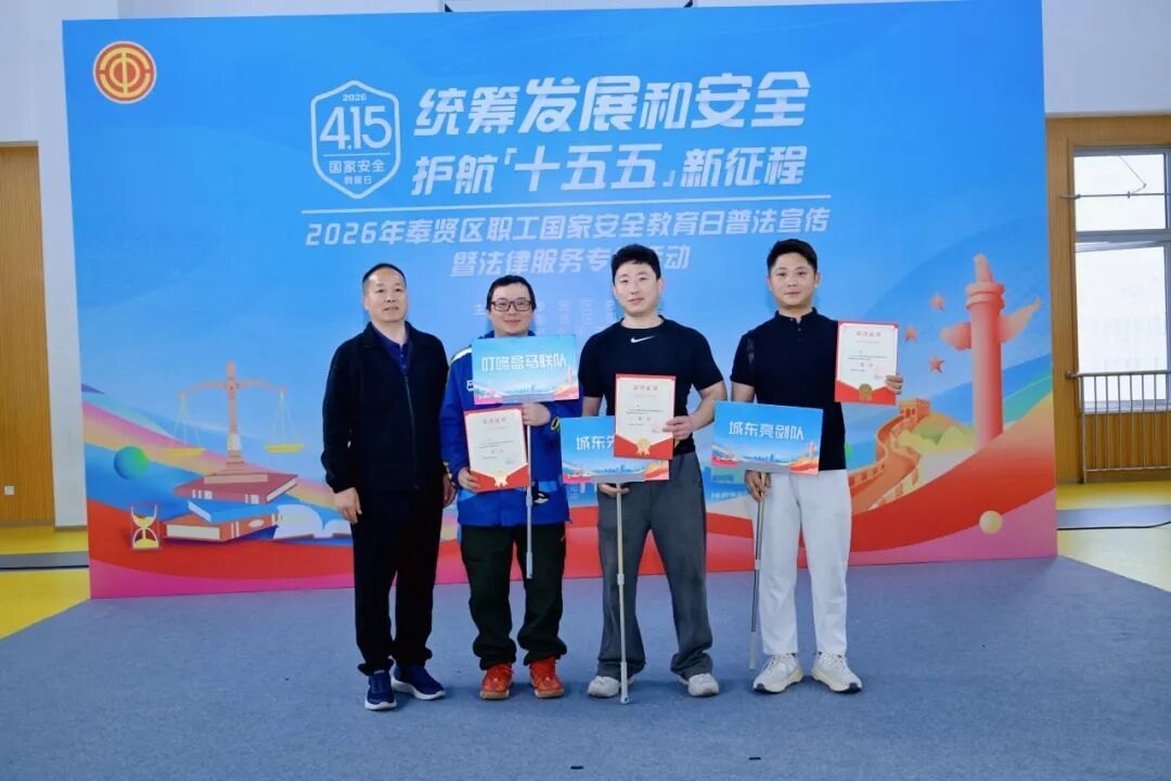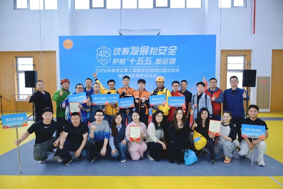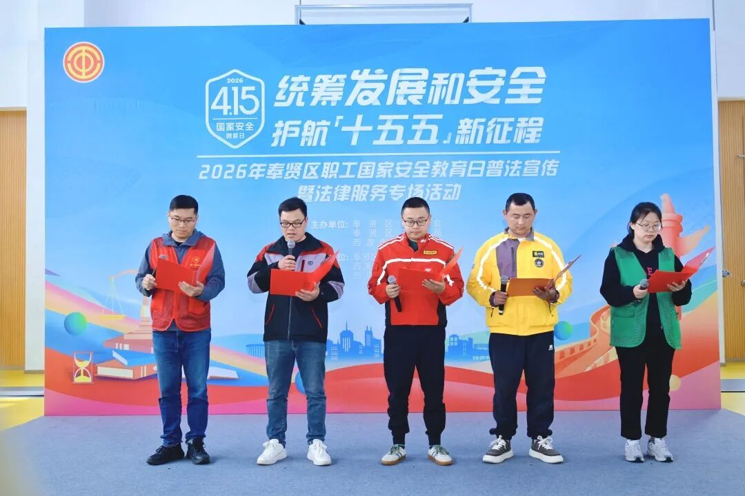4月15日,由奉贤区总工会、奉贤区司法局、西渡街道党工委主办的2026年奉贤区职工国家安全教育日普法宣传暨法律服务专场活动在西渡街道文体中心顺利举行,现场有来自快递物流、货运驾驶、网约送餐、网约车司机、网络主播等行业的60余位新就业形态劳动者参加,活动以“统筹发展和安全 护航‘十五五’新征程”为主题,将国家安全教育与普法服务、趣味运动深度融合,切实把安全意识送到职工身边。