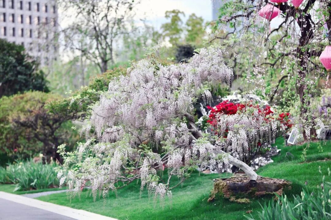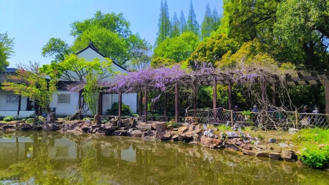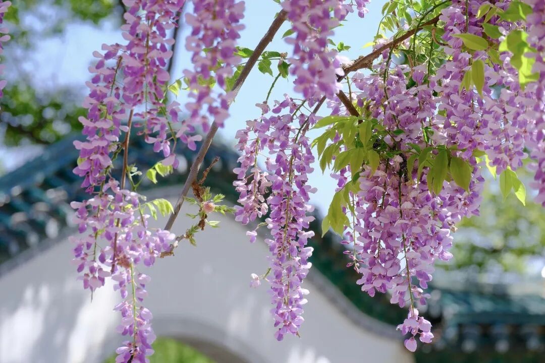 古园之清雅,藤花之柔媚,两相交融,一步一景,一景一画,俯仰之间,尽是诗心画意。