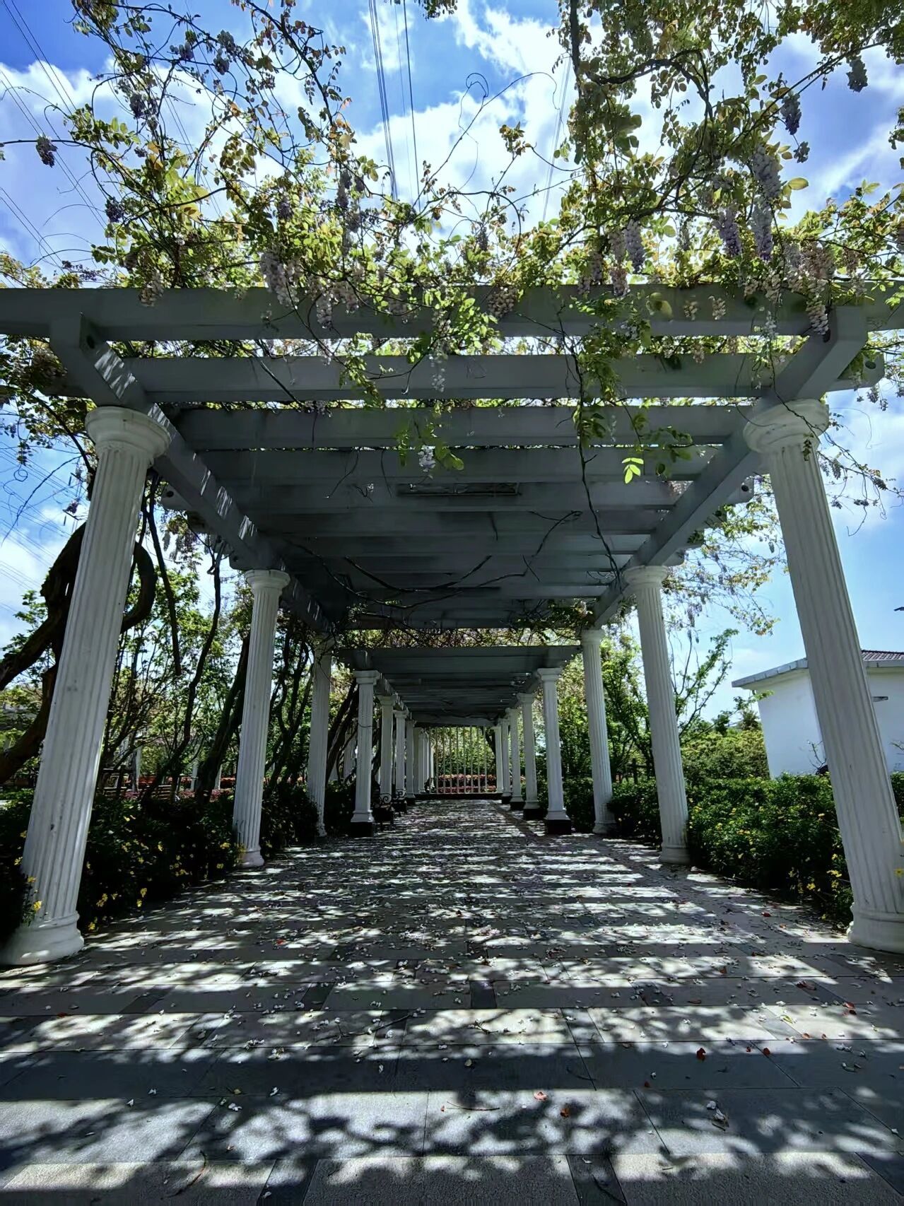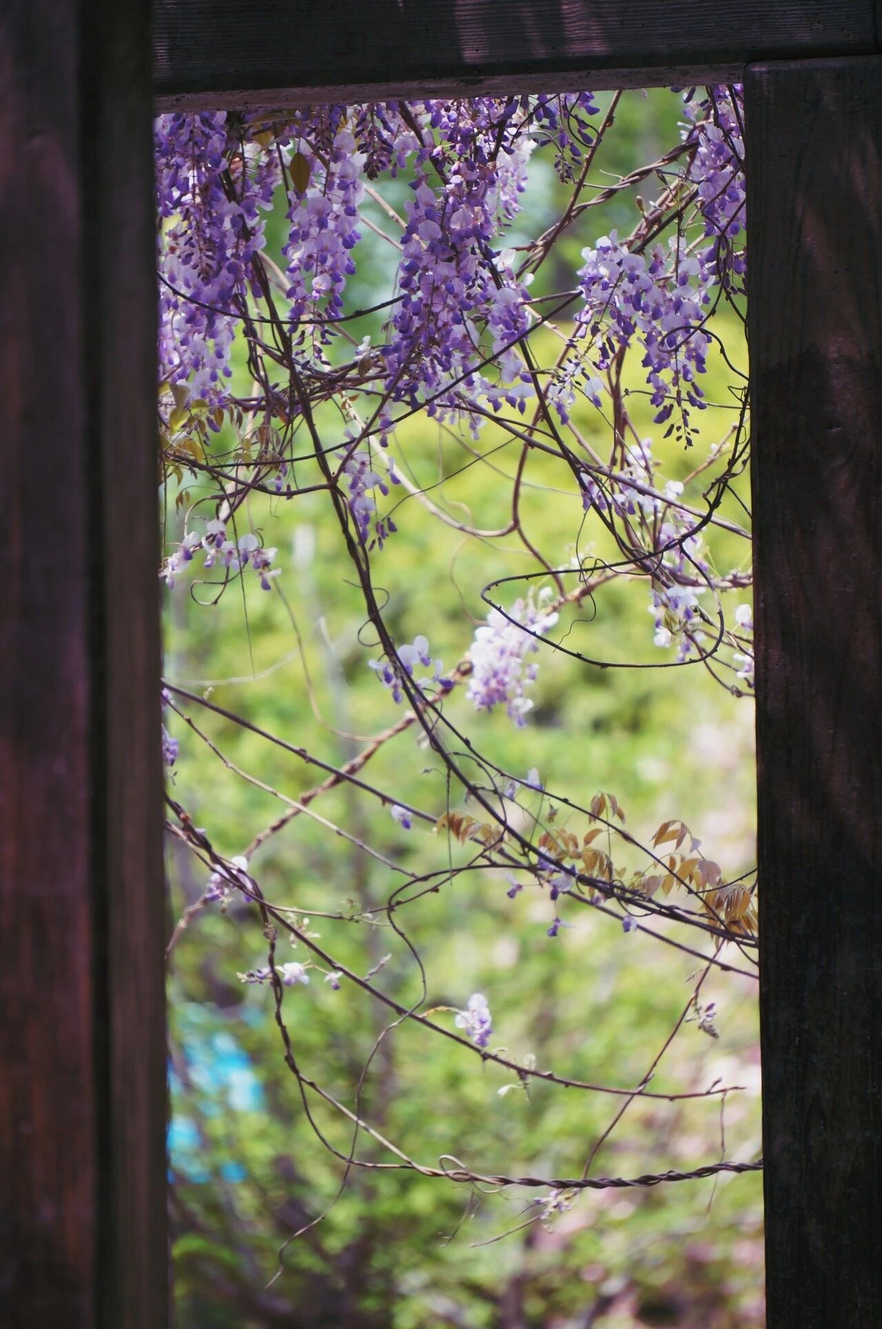 我是紫藤,住在西洋园。苗条的我已悄悄爬上了花架,垂下一串串紫色小花,像一帘幽梦,也像流动的瀑布。