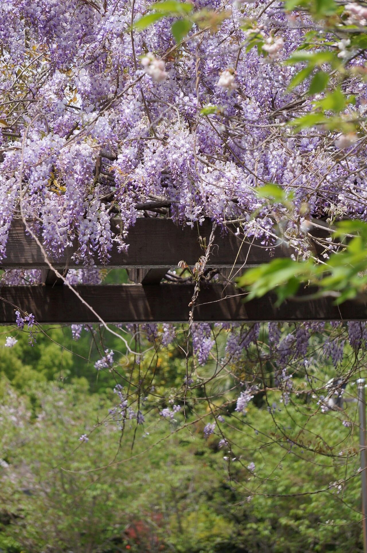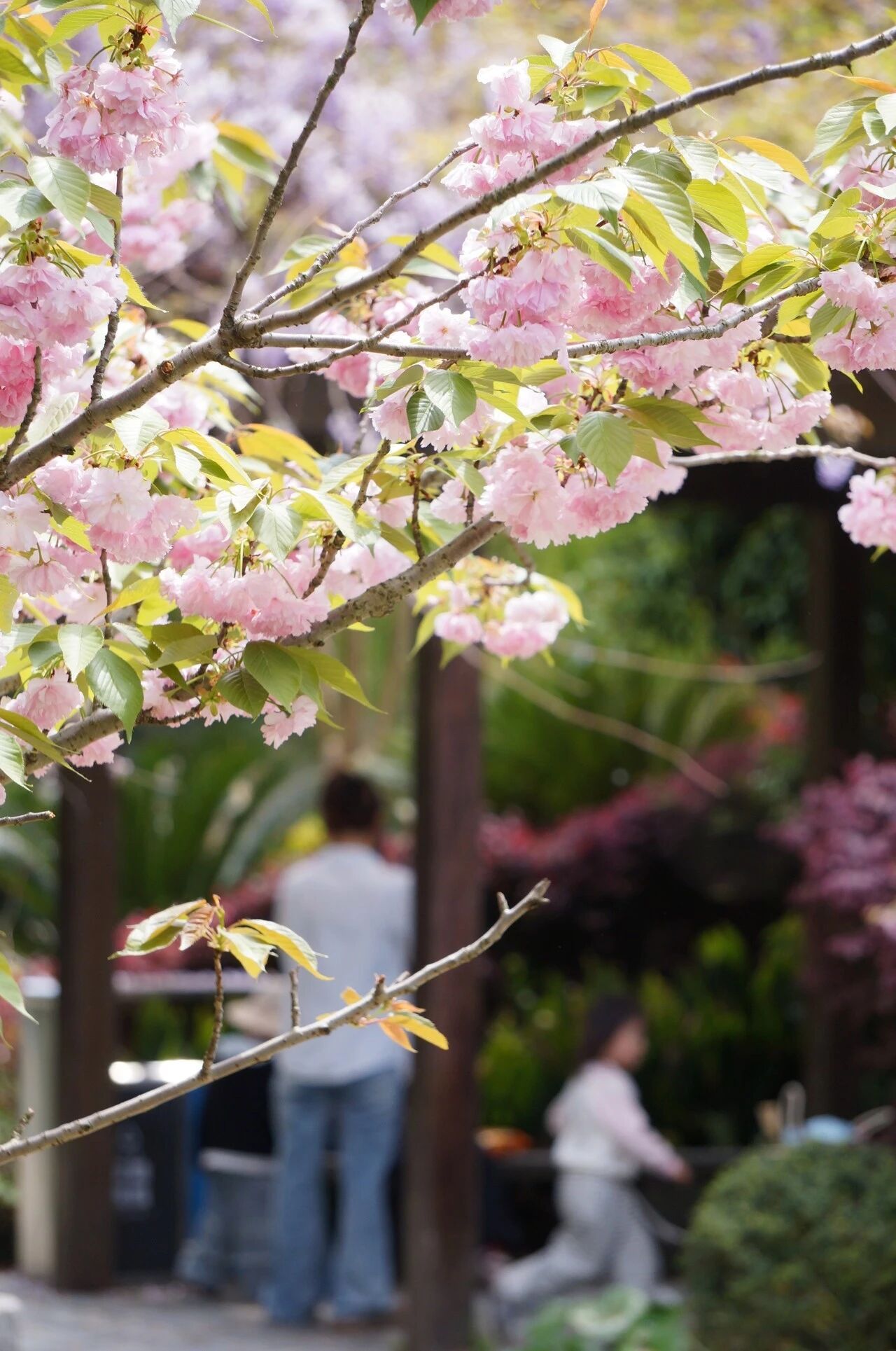 樱花、木绣球、紫藤、湖面、走道与长椅