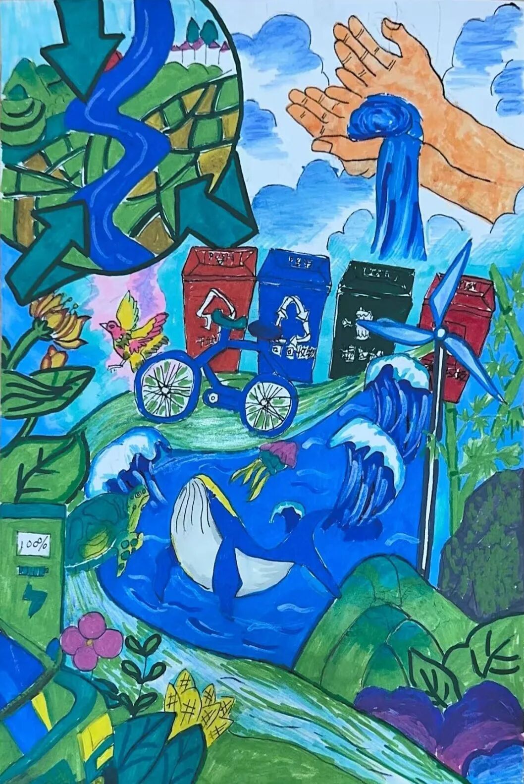 简介:画作用颜色鲜艳多彩的笔触,画出了马年的美好心愿:垃圾分类、绿色出行、清洁能源,表达了守护碧水蓝天,让万物在美丽家园里快乐生长的愿景。