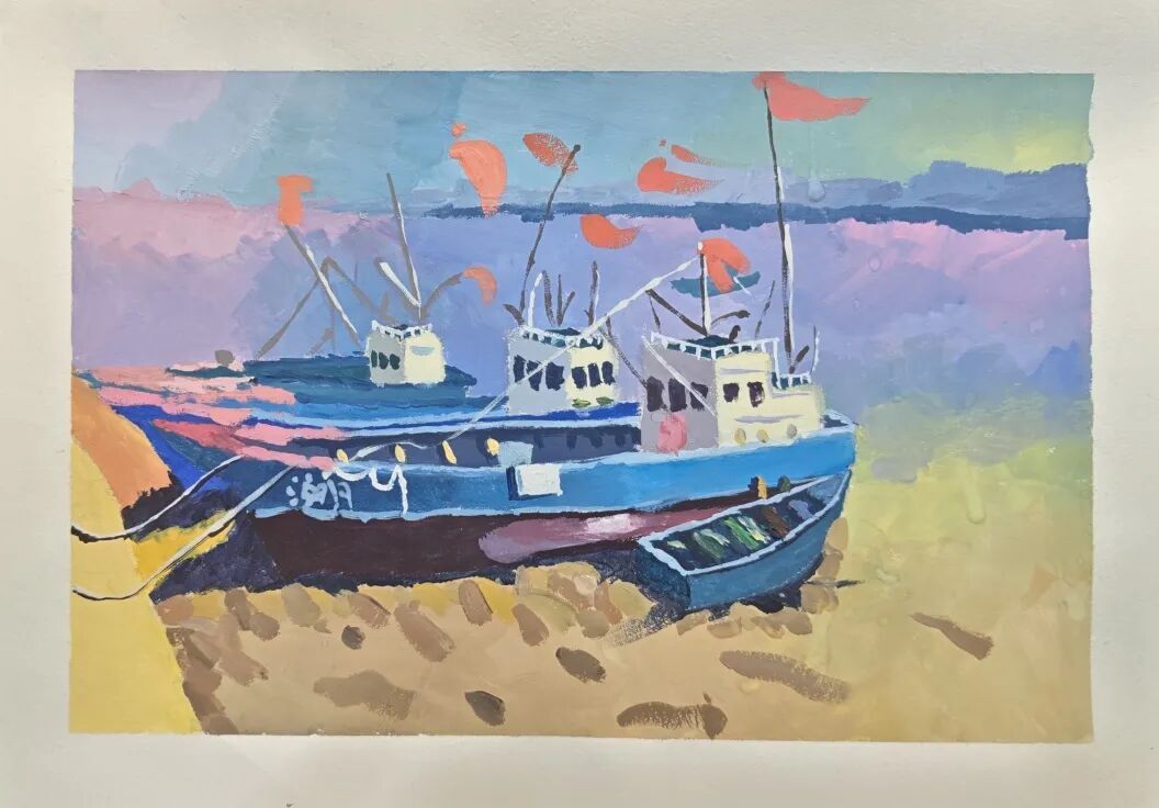 简介:这幅水彩作品以明快的色彩块面,描绘出黄昏渔港的静谧。蓝船静卧暖黄滩涂,紫粉天际与红旗相映,笔触粗犷却充满生活温度,尽显滨海暮色的浪漫与烟火气。