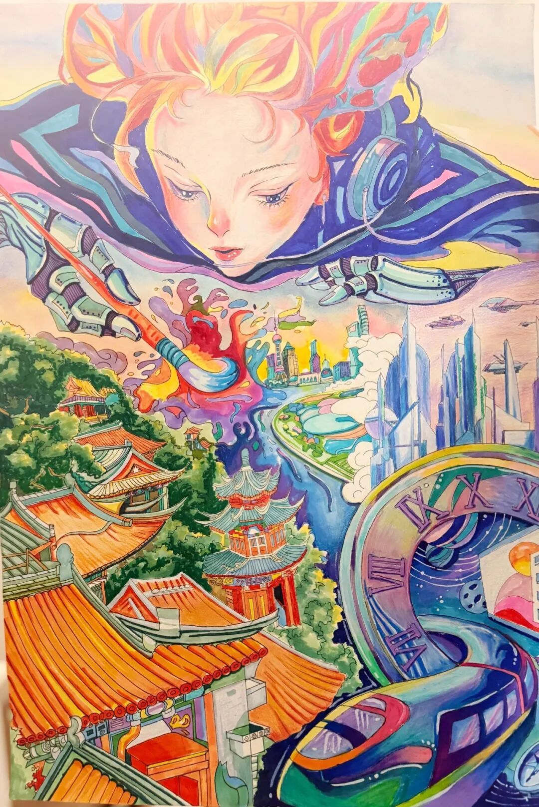 简介:画作以神笔少女为创作意象,一边是飞檐翘角的中式古建,一边是高楼林立的未来都市,用绚烂色彩展现传统与现代的交融,展现城市从历史走向未来的脉络,传递古今共生的愿景。