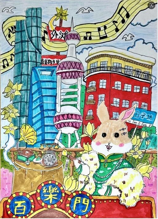 简介:画作中的兔子身着绿衣在百乐门舞台上,身旁是东方明珠、外滩建筑、南京路等城市符号,玉兰花、留声机、音符点缀其间,将老上海的摩登韵味与现代都市活力相融,尽显海派文化的鲜活与灵动。