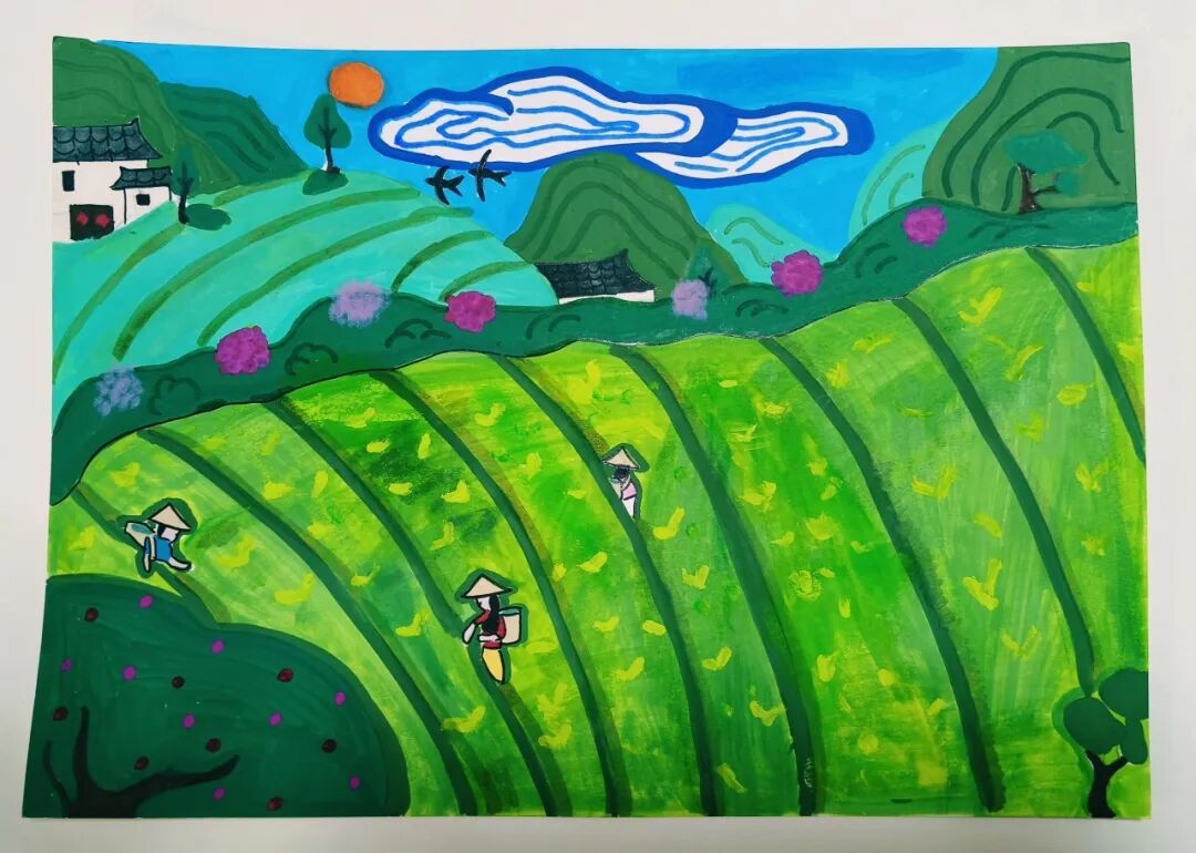 简介:画作描绘春日梯田茶园的劳作场景,层层叠叠的绿色茶田间,采茶人忙碌穿梭;远处青山、民居、山花相映;蓝天、红日、飞鸟点缀其间,是一幅充满诗意的画卷。