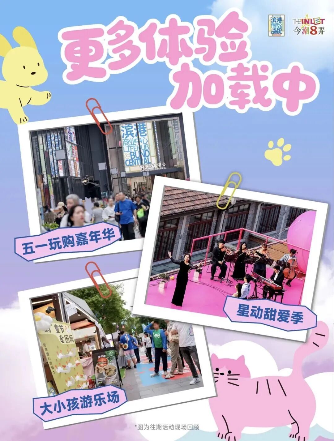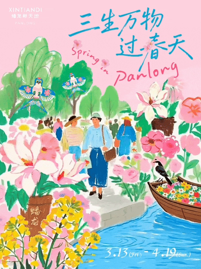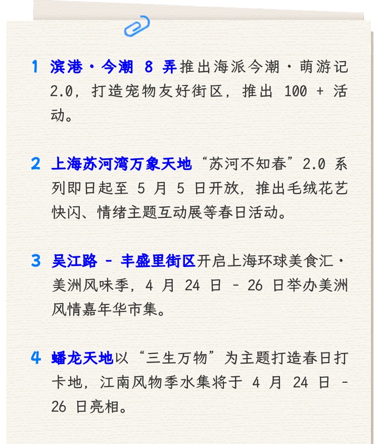 市文化旅游局介绍,上海的街巷不止错落建筑,更是烟火日常与生活诗意。春日款款而来,街巷繁花盛放,不妨趁着周末漫步沪上街区,邂逅烂漫春光 Spring 。 Part 01 走进“今潮8弄” 走进弄堂萌友花园 萌力全开!海派今潮·萌游记2.0元气回归,超有爱的“宠物友好街区“滨港·今潮8弄,构建“户外人宠共生+室内自然疗愈“双线沉浸场景,推出100+活动,邀请所有玩家共赴百年弄堂里的海派春日萌趣之旅。 巨型狗狗、淘气猫猫等超萌打卡点上线,还不快来漫步可可爱爱的萌宠街区! 还有春日活动花式上新,“花漾春日”大玩家快闪活动,花间彩虹椅、毛绒绒花园、律动疗愈屋……打卡机位已备好,记得把美好装进相册! 4月19日可以去听复旦大学音乐剧社的音乐剧GALA演出,4月26日的萌友总动员活动,和毛孩子一起遇见新朋友……满满惊喜玩法,收获春日满格能量。 「喵汪印象」弄堂萌友花园 即日起-6月21日 滨港·今潮8弄全景呈现 Spring 。 Part 02 走进“苏河湾” 走进步步生花的诗意秘境 日前,一艘满载繁花的航船从苏州河而来,停泊于百年石库门建筑——慎余里前,花意从船头漫出,一路流淌至天桥之上,向着上海的更高处蔓延。循着这条花浪航迹,市民可在城市中心开启一场步步生花的春日漫游。 即日起至5月5日,上海苏河湾万象天地“苏河不知春”踏春归来,2.0系列花期更长, 花事更盛。 苏河不知春除了自然美景外,更有超多独家、首秀快闪及活动轮番登场,让春日的趣意从公园的繁花蔓延至苏河湾的峡谷。持续到4月19日的毛绒花艺快闪,以“超现实花园”为核心主题,打造一场触感沉浸的艺术体验。 4月24日-4月26日,还将发起一场关于“好好生活”的公共练习,用一个周末的时间,在城市最繁花盛开的地方,搭建一座通往内心的临时驿站。把那些关于“如何与自己情绪好好相处”的思考,变成四个主题展区,可以亲手触碰的装置、可以匿名倾诉的树洞、可以参与的工作坊体验,可以坐下来聊会儿天的角落。 这个周末,登上这艘满载繁花的航船,一起探寻苏河湾里春意与秘密吧。 苏河不知春 即日起-5月5日 上海苏河湾万象天地 Spring 。 Part 03 走进“吴江路-丰盛里街区” 走进美洲风味季 丰盛里位于南京西路历史风貌区内,由10栋石库门风格建筑组成。充分融合了上海历史风貌建筑、轨道交通建设和现代商业零售等多种元素,同时还引进了很多海外特色餐厅,让丰盛里成为了具有海派文化的城市空间,是一个极具海派文化烙印的新地标,是摩登的潮流聚集地。 2026年“上海环球美食汇·美洲风味季活动”已在吴江路四季坊广场启幕,此次美洲风情嘉年华将吴江路整体化身为一座沉浸式美洲空间,进入街区仿佛置身广阔的美洲世界。 更特别的是,现场通过美食的香气带来美洲气息的嗅觉体验,让观众在感官的多重交织中仿佛穿越时空。在这场视、听、嗅多位一体构筑的沉浸式场景中,仪式本身便成为一场不可复制的感官盛宴。4月24日-26日在街区还会有味“美”静安·美洲风情嘉年华市集,趁着周末,不如去街区逛集吧。 上海环球美食汇·美洲风味季 市集 4月24日-26日 上海吴江路-丰盛里街区 Spring 。 Part 04 走进“蟠龙天地” 走进三生万物的明媚春日 这个春日,蟠龙天地以“三生万物”为核心概念,依托独有的自然力与江南春色,打造了集赏花、市集、体验于一体的高颜值春日打卡地。春漾纸鸢竹筏、鸬鹚鸟船、蟠龙水集·花鸟鱼市……多重春日限定体验次第铺展,一步一景皆是江南好春光。 自2024年第一届“江南风物季“开始,蟠龙天地持续关注江南焕新,从解构织造,到剪影江南,再到顺水成市,三周年之际,蟠龙将以水脉,以市为魂,把记忆里的江南,重新带回海派生活的日常。 今年,蟠龙从百年前的米市、布市、鱼市出发,呈现一个焕新的“水上之市”,4月24-26日,来蟠龙,赴一场江南水市之约,遇见自然生长的江南。 三生万物过春天 即日起-4月19日 江南风物季水集 4月24日-26日 上海市青浦区蟠鼎路123弄8号