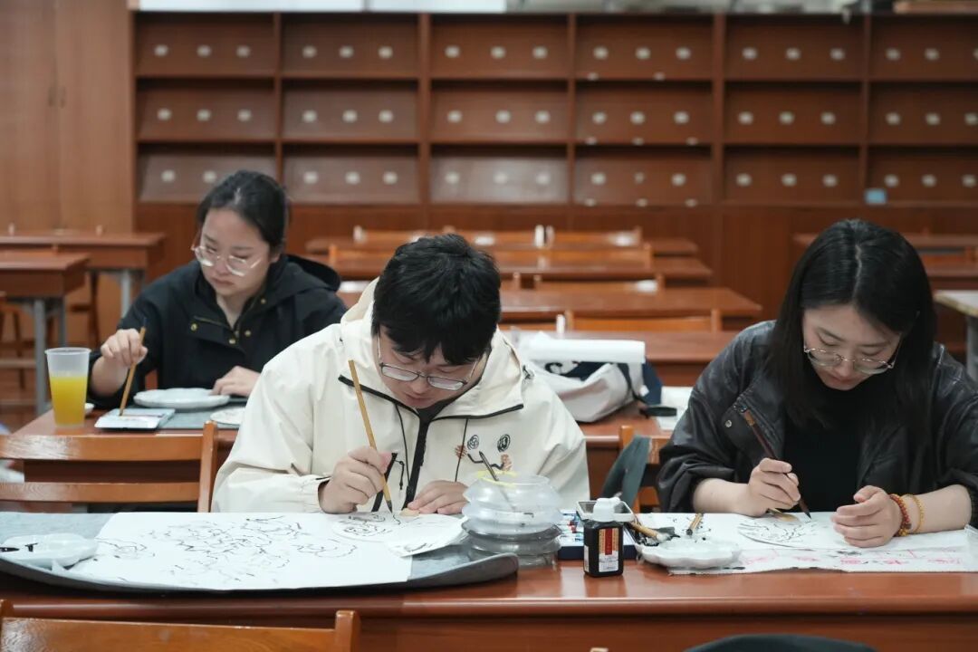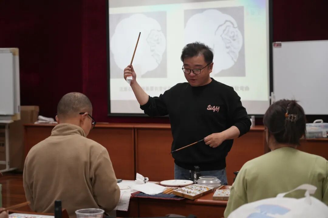 在他的示范下,学员们屏息凝神,体验着在扇面上勾勒花瓣与枝条的独特笔触。学员王女士已是连续第二年参加市民夜校,她分享道:“去年跟着张老师学了一期花鸟山水,因为从小就很喜欢国画,今年看到开了水墨扇面就立刻报名了。今天第一节课学迎春花,感觉和在宣纸上很不一样,面积不同,整个画面的构图逻辑都变了,能在团扇上画出意境,觉得挺开心的。”