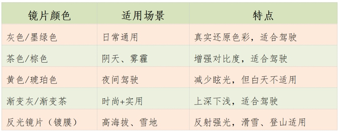 2.选择太阳镜镜片颜色需结合使用场景,日常推荐灰色或茶色镜片。