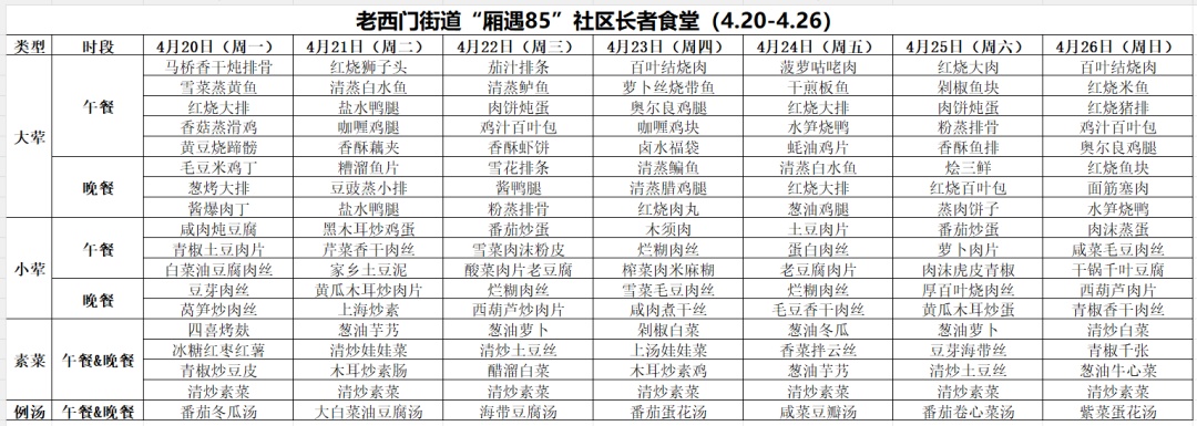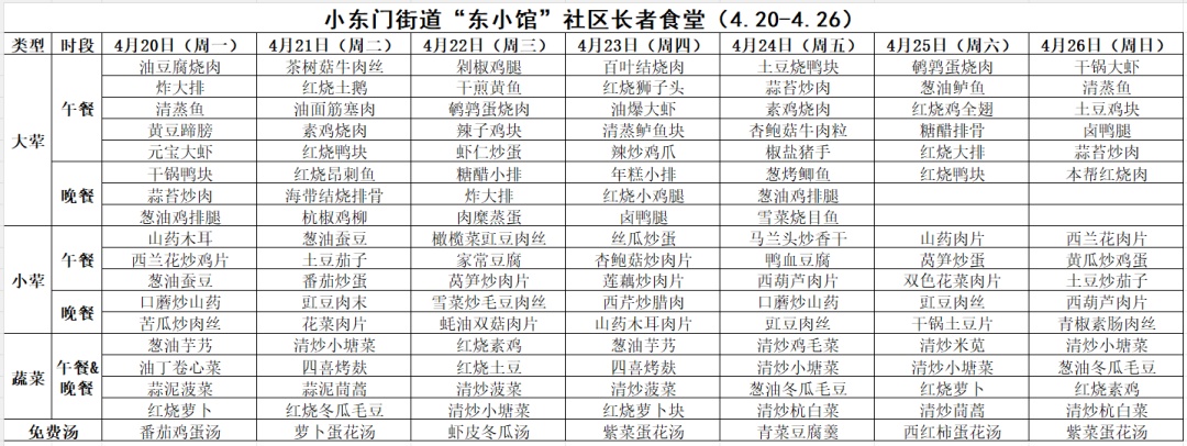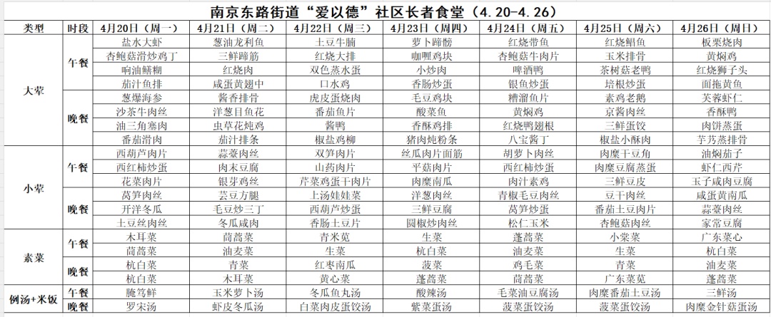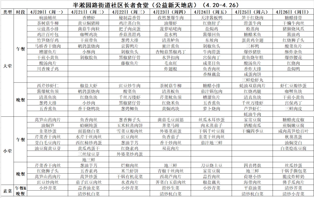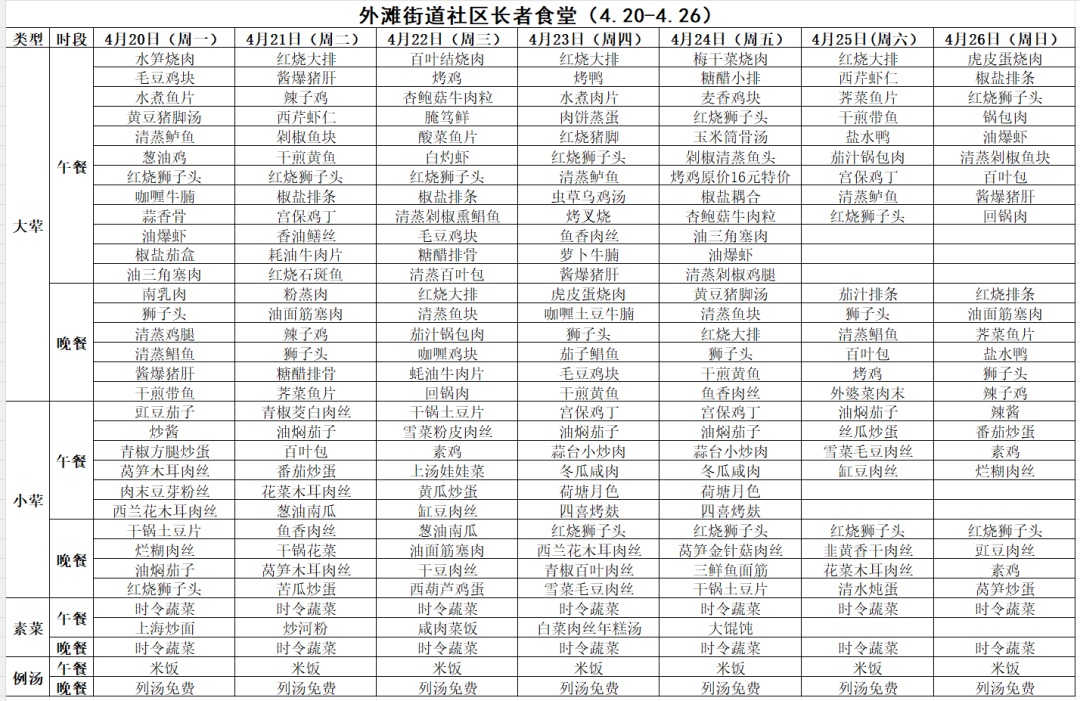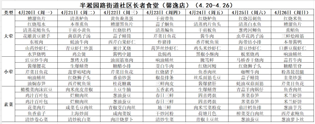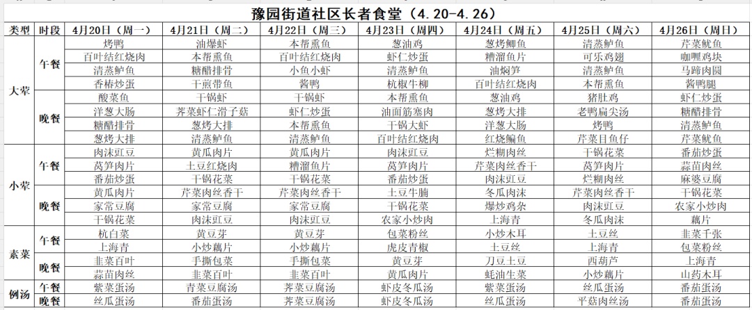黄浦区社区长者食堂一周菜单(4.20—4.26)
