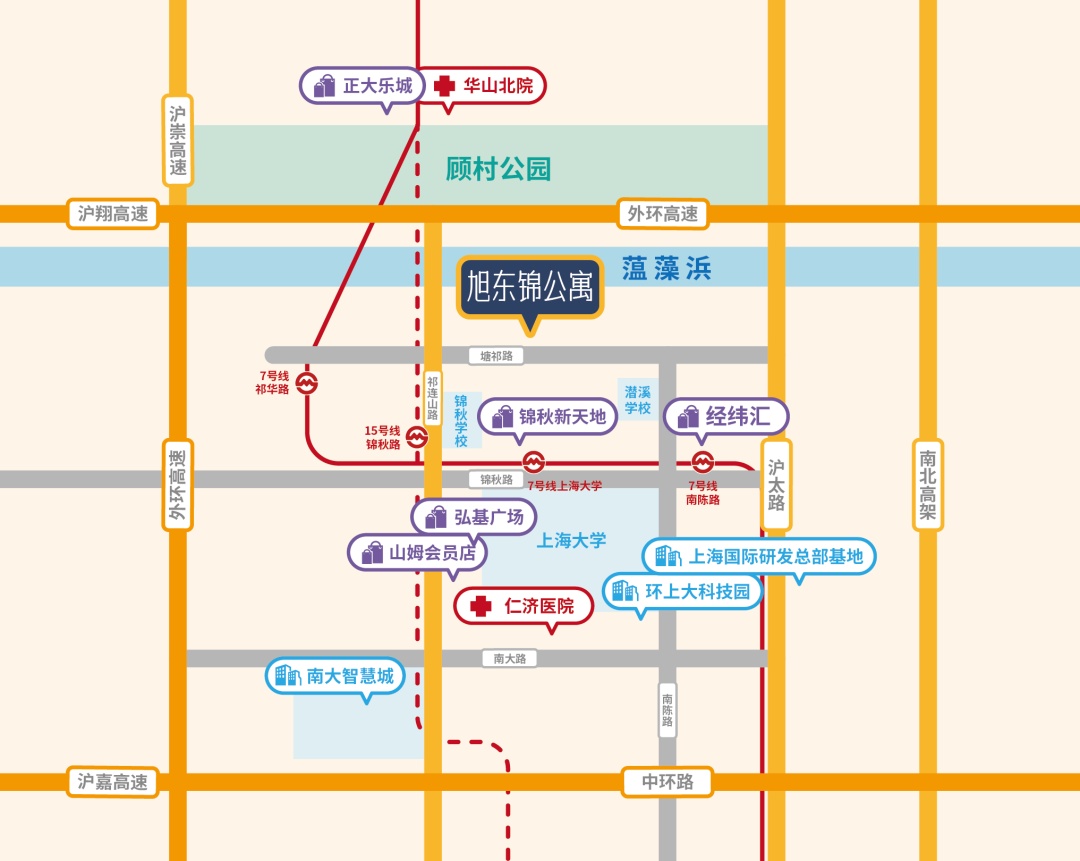 项目毗邻上海大学与南大生态智慧城,精准服务高校毕业生、科创人才等重点群体。周边经纬汇、山姆会员店等大型商业综合体环伺,华山北院、仁济医院等优质医疗资源就近覆盖,形成集商业、医疗、休闲于一体的“15分钟社区生活圈”,全方位满足青年人才日常需求。