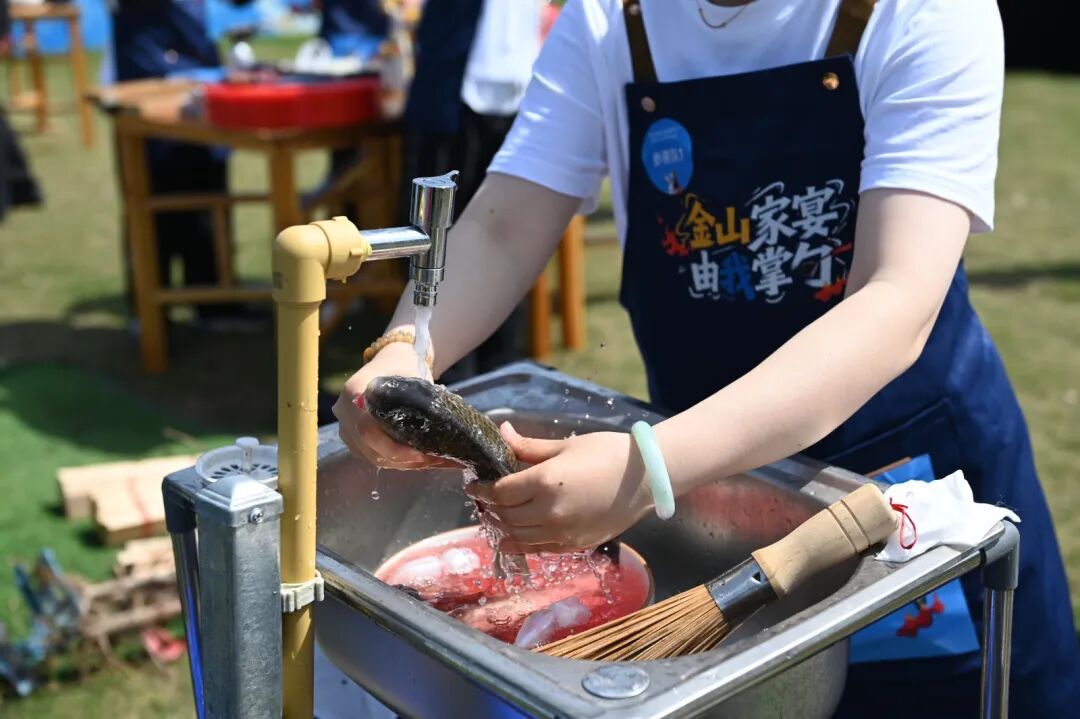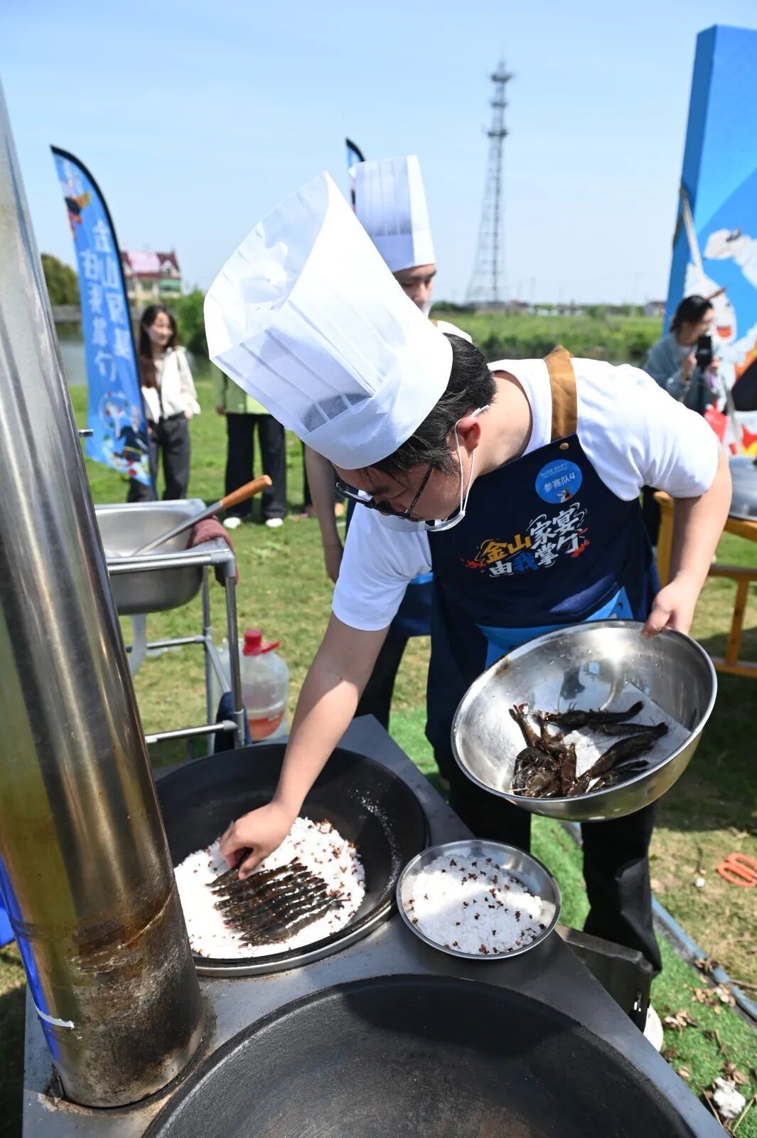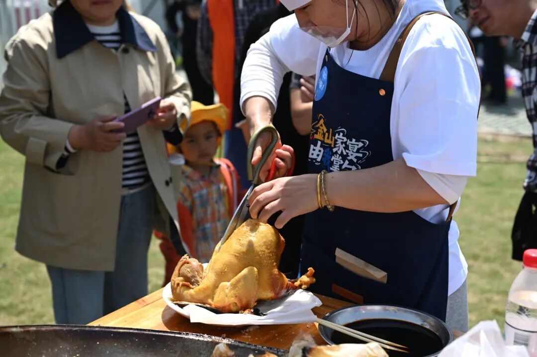 根据本次比赛规则,每支参赛队伍需完成三道菜品的烹制,层层考验选手们的厨艺功底与创意巧思。第一道为指定菜——金山宴水库鲫鱼塞肉,作为金山宴的特色招牌菜,既考验选手的基础刀工,也要求对食材本味的精准把控;第二道为盐焗系列菜,以漕泾深厚的海盐文化为灵感源泉,选手可自由选择食材,尽情发挥创意;第三道为自选菜,选手们可亮出看家本领,充分展现个人厨艺特色与团队风格。