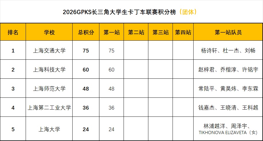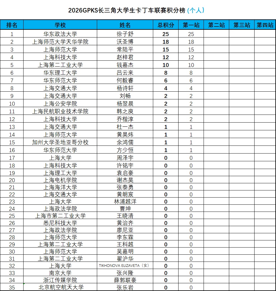 2026赛季,GPKS长三角大学生卡丁车联赛共设四站赛事,全年赛事将覆盖不同类型赛道,为参赛选手带来多元化竞技挑战。赛事赛程方面,揭幕站与收官站均落户GPKS东体卡丁室内赛场,第二、第三站将转战室外卡丁车赛场,进一步丰富赛事体验。本赛季同步设立个人积分与团队积分体系,配套颁发个人荣誉奖项与团队荣誉奖项,全面激发参赛选手与高校团队的竞技热情。