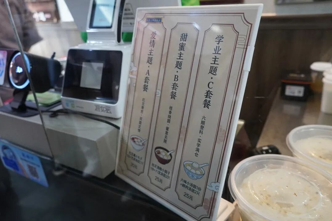 此外,店内还同步推出爱情、甜蜜、学业三大主题套餐,每个套餐都有独特的寓意。“说到‘爱情’,我们会想到‘红豆寄相思’,所以在爱情主题套餐里加入了红豆羹小丸子。”郑长江特别提到学业主题套餐里的“六味小汤圆”,除了数量上寓意“六顺登科”,也在口味上做了搭配。