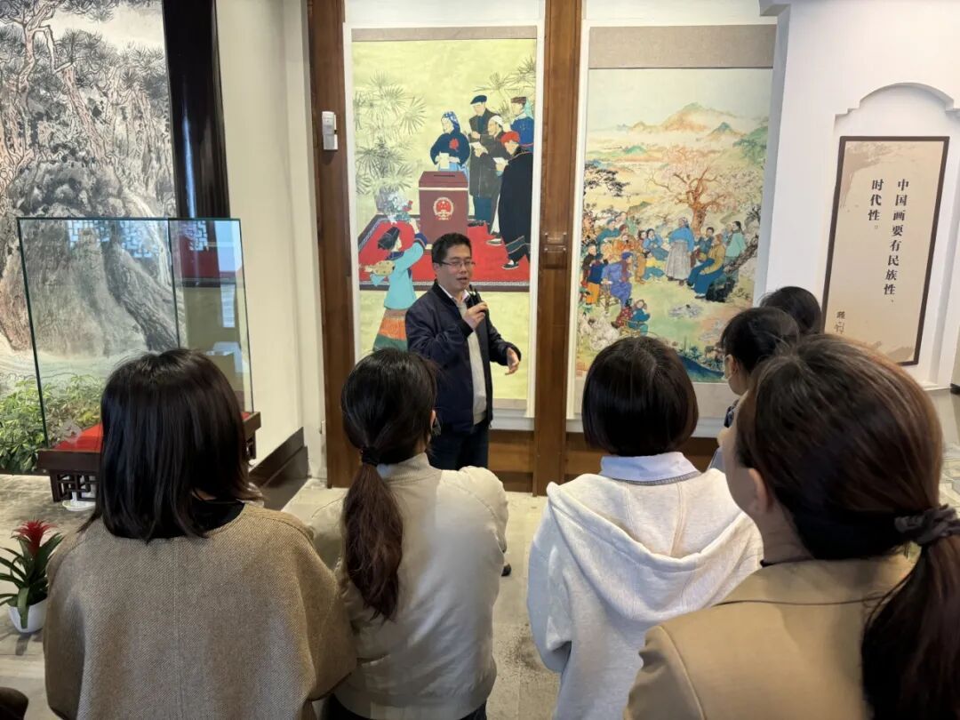 在艺术馆工作人员的引导下,大家依次参观了“程十发先生生平展”及“日照春山花满枝——程十发藏明代花鸟画研究展”,在翰墨丹青中感受艺术魅力与中华传统文化底蕴。随后,大家还观看了程十发艺术馆15周年宣传片,回顾艺术馆在传承海派文化、弘扬艺术精神、发展公共教育方面取得的丰硕成果。活动打破传统读书学习模式,通过“观展、观影、听讲”等沉浸式文化体验,将理论学习与实践感知深度融合,打造一场流动的文化课堂。