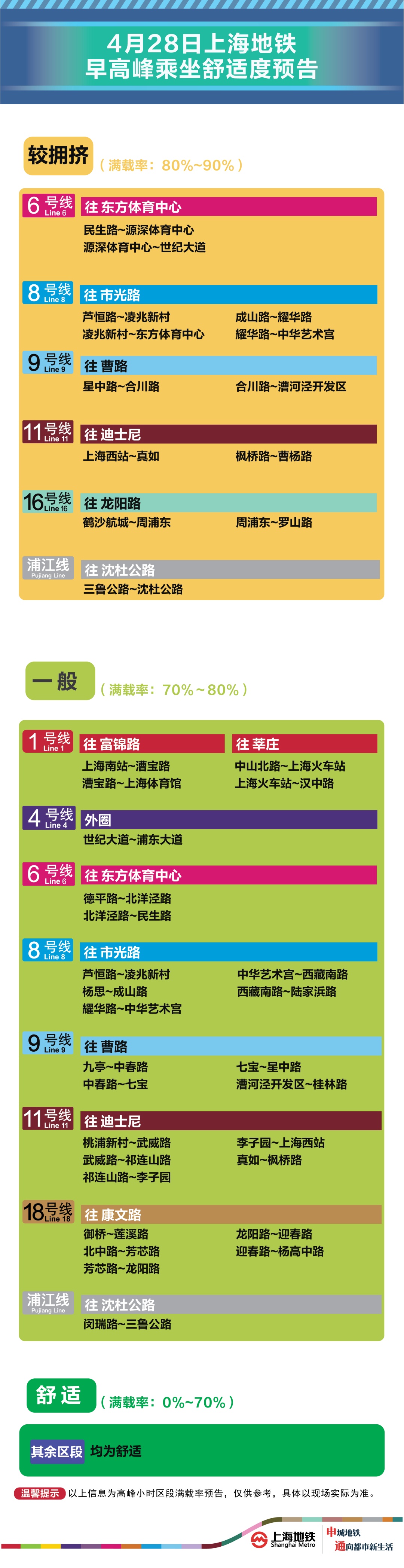 为提升上海地铁早高峰期间出行服务水平,提升乘客乘坐体验,上海地铁向乘客提供乘坐舒适度预告,方便乘客提