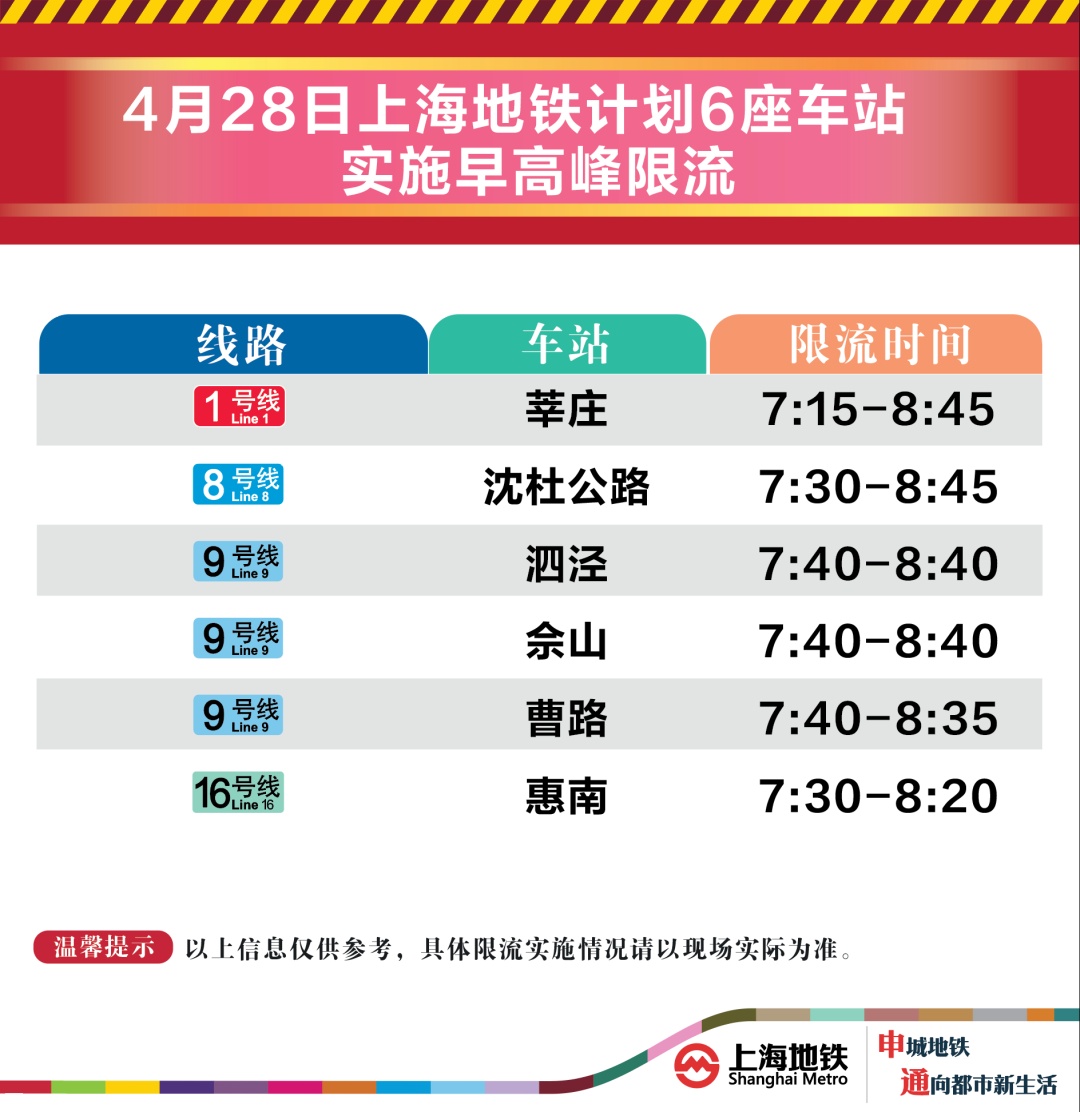4月28日早高峰泗泾、佘山等6座地铁站计划限流