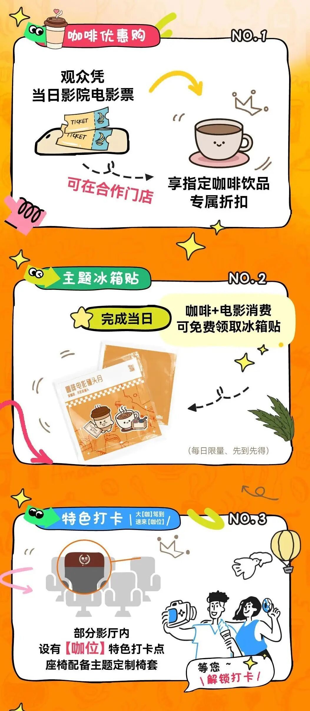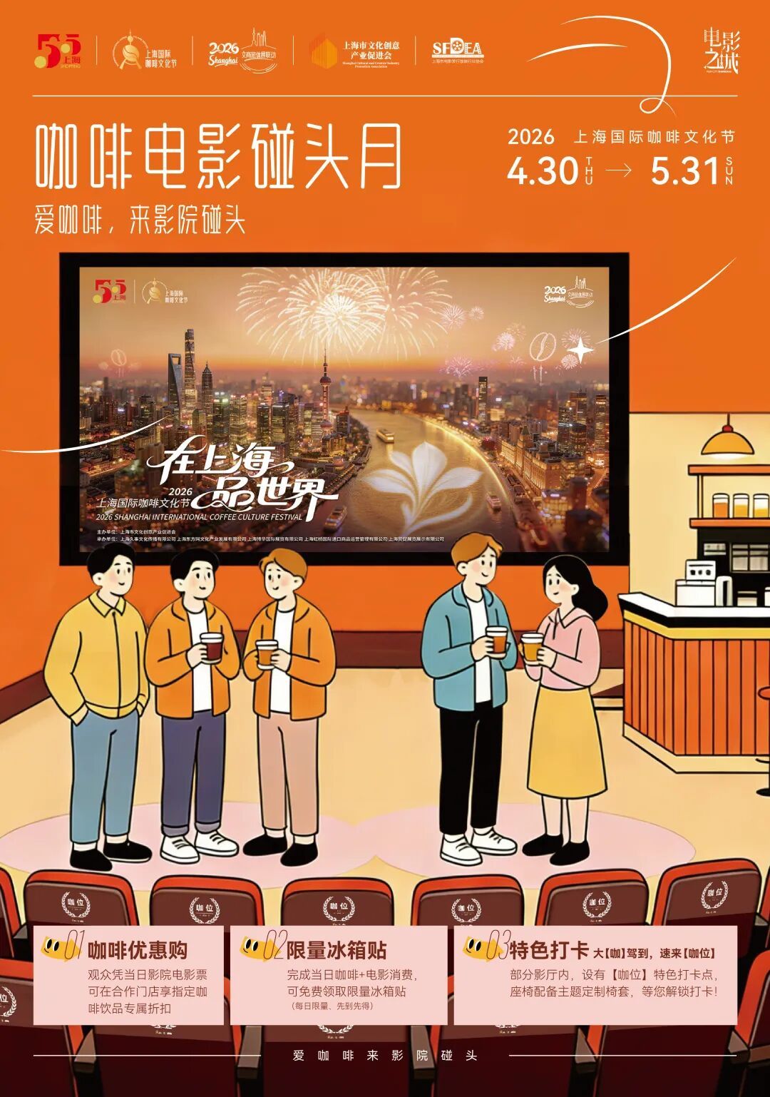 4月30日至5月31日,作为“五五购物节”标杆活动之一,2026上海国际咖啡文化节推出“咖啡电影碰头月”主题活动,以“爱咖啡,来影院碰头”为口号,联动全市多家影院,打造咖啡与电影融合的沉浸式消费场景。其中,普陀三家影院同步参与活动,有效激活“票根经济”,丰富文旅消费新供给,助力上海“咖啡+影视”跨界融合氛围持续升温。 本次活动推出三大核心玩法,打通观影与咖啡消费场景。观众凭活动期间的当日电影票,即可在合作咖啡门店享受指定饮品专属折扣;完成“咖啡+电影”的当日消费,还可免费领取活动限定主题冰箱贴。此外,部分参与影院设置了“咖位”特色打卡点,座椅配备主题定制椅套,为影迷提供充满咖啡氛围的打卡场景。 作为普陀区参与活动的三家影院,博悦汇影城上海环宇城IMAX店、SFC上影影城(金沙江路店)、AMG海上明珠影城环球港店将同步落地活动权益,市民可前往上述影院观影,解锁咖啡折扣、限定周边与特色打卡体验,在光影与咖啡香中邂逅春日趣味。 在AMG海上明珠影城环球港店,活动期间影院推出48元优惠套餐,内含一杯咖啡和一桶爆米花。 在SFC上影影城金沙江路店(近铁城市广场),咖啡电影碰头月活动期间(4月30日至5月31日)推出多重福利,凭电影票可享指定咖啡饮品买一送一;持LAVAZZA咖啡+电影消费可免费领取限量冰箱贴;影院4号RealD厅还是本次活动的打卡特色“咖位”主题点位。 咖啡电影碰头月活动期间,在博悦汇影城上海环宇城IMAX店,观众凭本影城当日电影票可享星巴克咖啡(瓶装)优惠活动,影城另有其他多款套餐选择。 记者:王笛 编辑:姜天澍