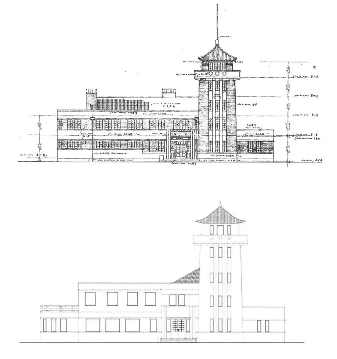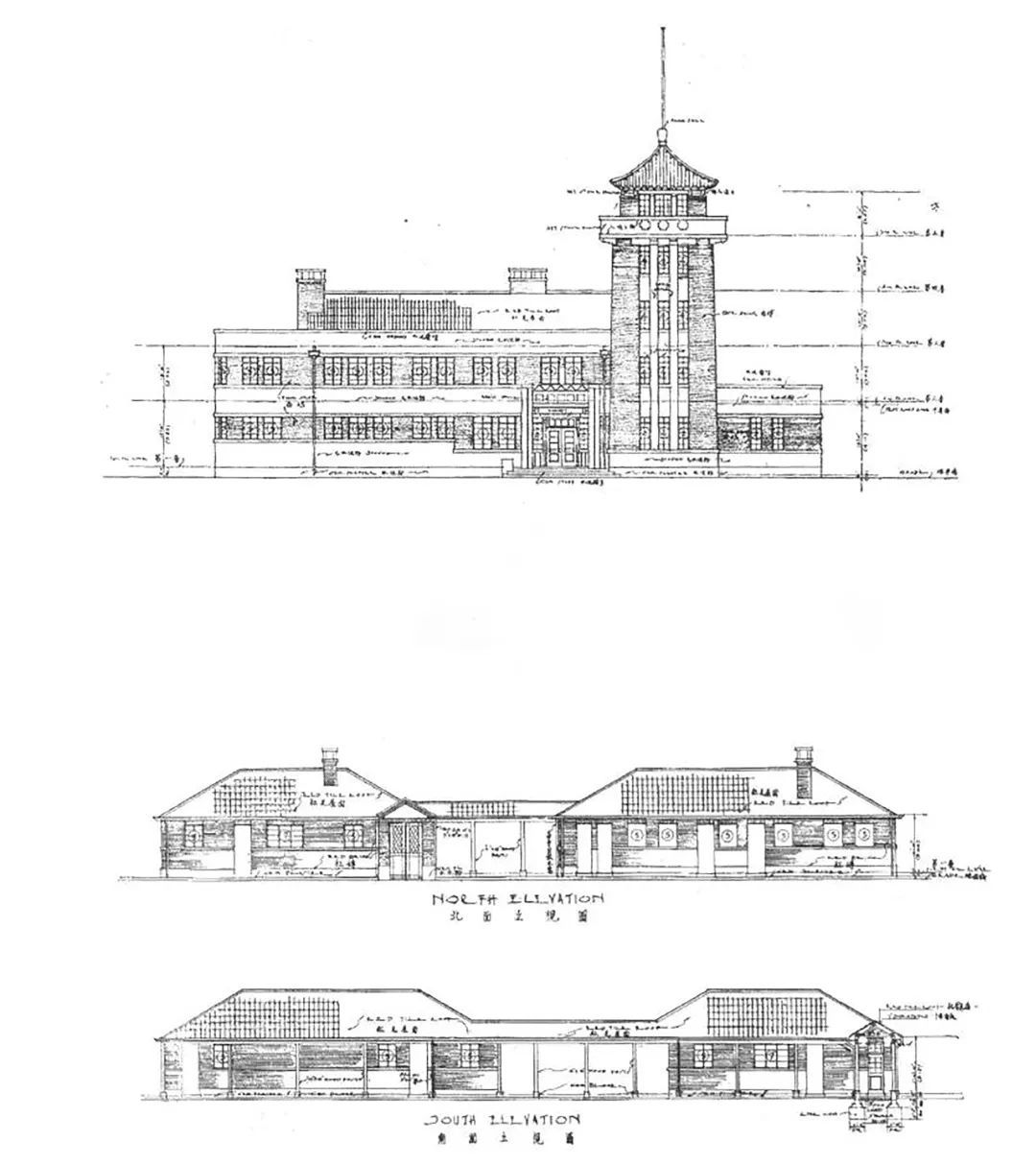从最初的设计图纸和一些老照片上,我们可以看到它昔日的风采:主楼墙面为简洁明快的红色清水砖墙,局部窗间外墙采用浅色水泥砂浆粉刷,形成材质和颜色上的反差。不同材质的墙面之间由横向线条分割,除了主入口处的凹凸线脚装饰,墙面上没有多余的装饰元素。屋顶的双坡红瓦,突出屋面的壁炉烟囱,带有显著的西式风格。五层塔楼高耸,屋顶为中国传统建筑特有的飞檐和四角攒尖顶,满铺红色筒瓦,顶层四面外廊栏杆上以12个十字形镂空图案呼应检疫医院的功能定位。