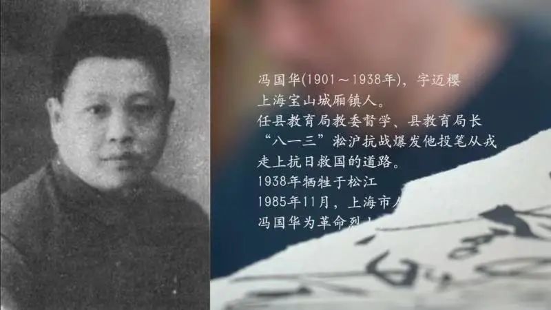 冯国华,字迈樱,1901年生于宝山。是位教育家,却在1937年“八一三”淞沪抗战爆发后弃了笔从了戎,走上抗日救国的道路,带着诸多曾受他训练的学员为战地输送弹药、运送伤员、挖掘战壕,并招集了上海近郊各县的失业教师和失学青年500多人组成敌后游击队,在当时的上海县,以及松江、青浦一带开展游击战,1938年10月于松江遇日军包围,壮烈牺牲。2020年经党中央、国务院批准,公布为著名抗日英烈、英雄。