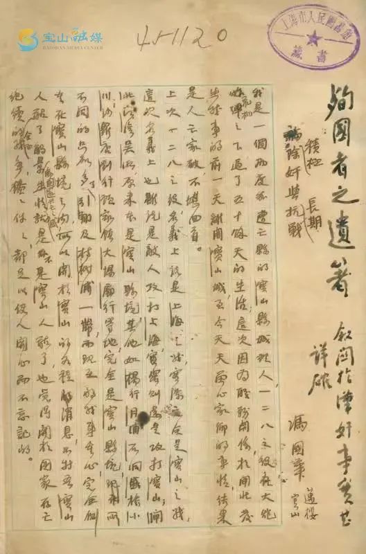 手稿名为《论积极除奸与长期抗战》,落款“冯国华”,满满的15页,只念完第一页,文字里对于宝山的牵挂与哀叹,便叫人无比动容: