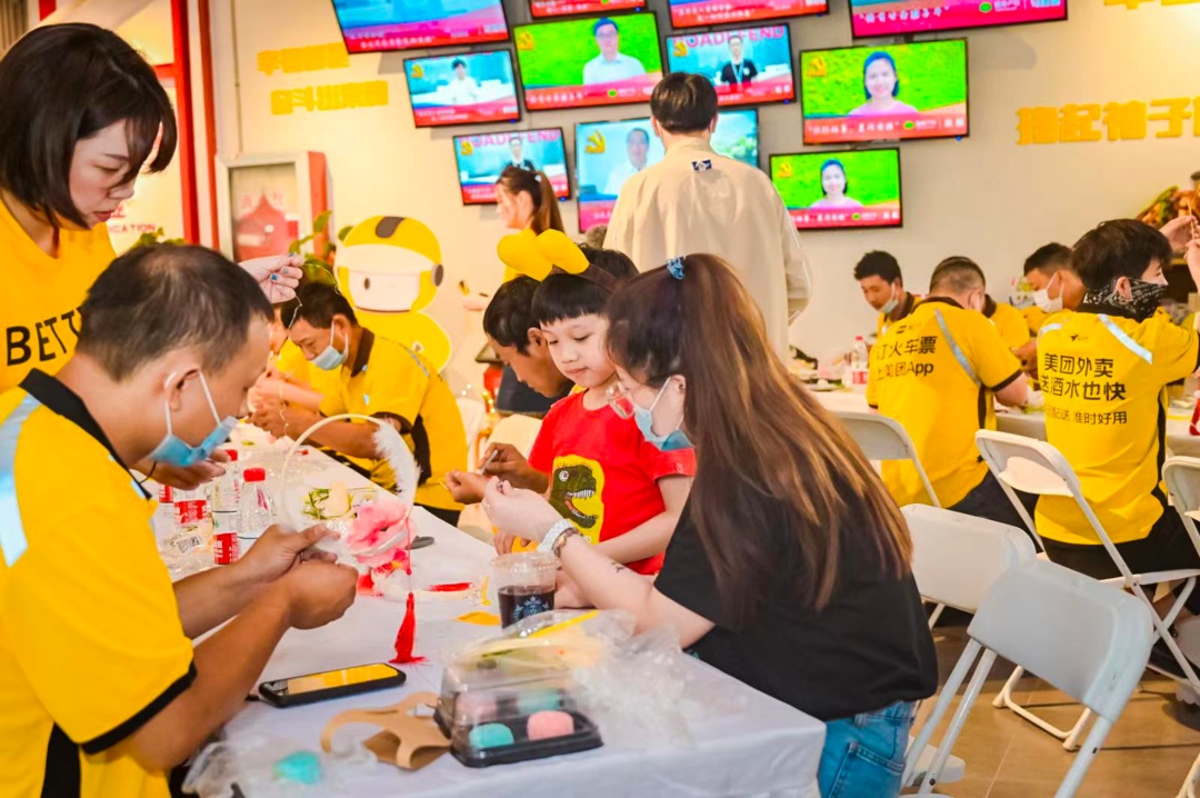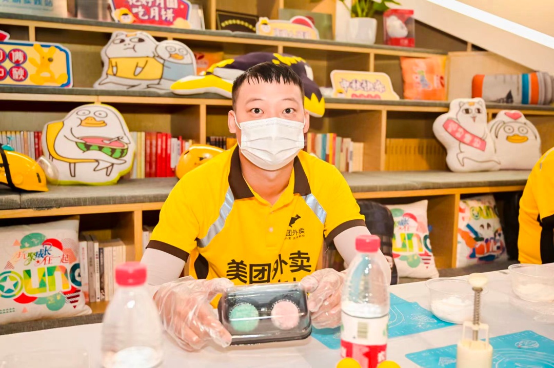 调馅料、揉面团,轻轻一按模具,一块印有“中秋团圆”字样的月饼雏形就呈现在眼前。在工作人员的示范下,骑手小哥们亲自动手,很快,一个个五颜六色的冰皮月饼摆满了桌面。大家迫不及待地品尝自己做的月饼,香甜软糯的口感令人交口称赞。