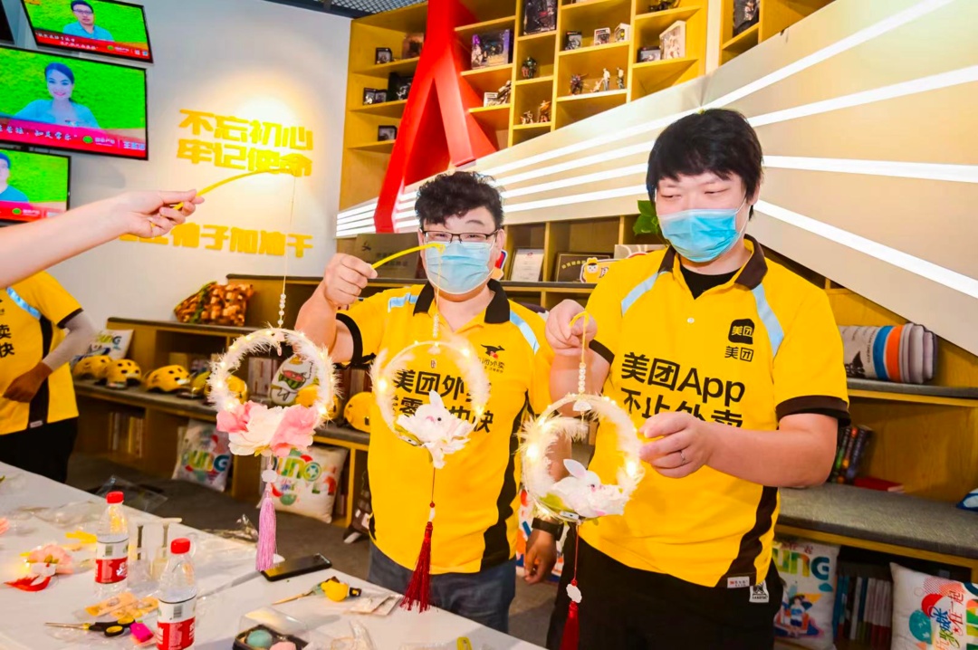 来自安徽的骑手陈嘉明也制作了一个兔子灯笼,“这个兔子灯我等下回去就寄回老家,给我六岁的儿子玩。”他还将领到手中秋月饼寄给家人,半年多没见儿子了,他希望能将这份祝福带给家人,让全家人都能健康快乐。