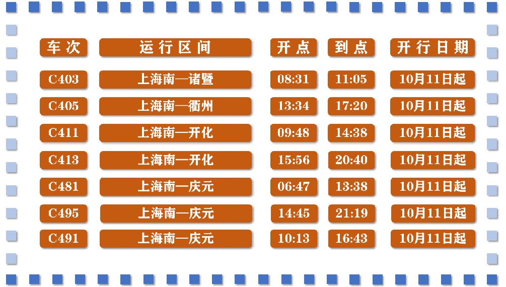10月11日零时起全国铁路将实行第四季度列车运行图。新图实施后,铁路上海站将首开上海虹桥至张家界高铁列车,优化上海南站与浙江多地间“绿巨人”开行结构。具体有哪些变化呢?详见↓